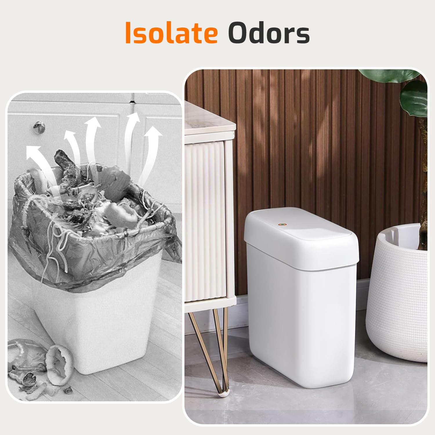 PET-PROOF GARBAGE CAN: The press top lid isolates odors and keeps the space fresh. No worry about naughty dogs or other pets tipping over the space saver wastebasket, avoids them from accidentally eating the trash and messing up your tidy home