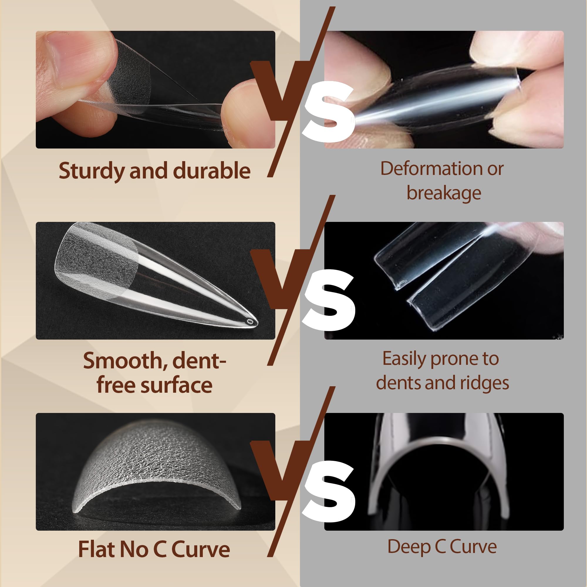 【Natural Fit Effect】 - The soft long fake nails feature a “ Thin back edge, thick front edge”. The thinner back edge can make the full acrylic nails fit your nails better. The clear surface of gel nail tips makes the color more visible. The thickened front edge makes it not easy to break or bend, having a longer lifespan. Just like your natural nails!