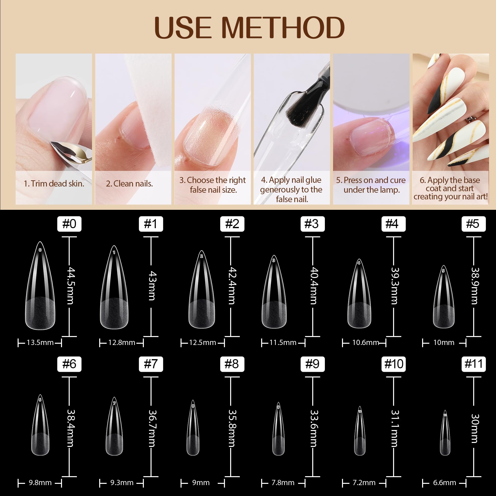 【216 Pcs,12 Sizes, Pre-numbered】- Extra Long Stiletto nail tip 216 pieces, 12 sizes, you can find the best size nails tips. The gel nail tips are marked with numbers at the top which is very convenient for you to choose the suitable size you need. And the fake nail tips with the box will provide you with convenient and tidy storage.