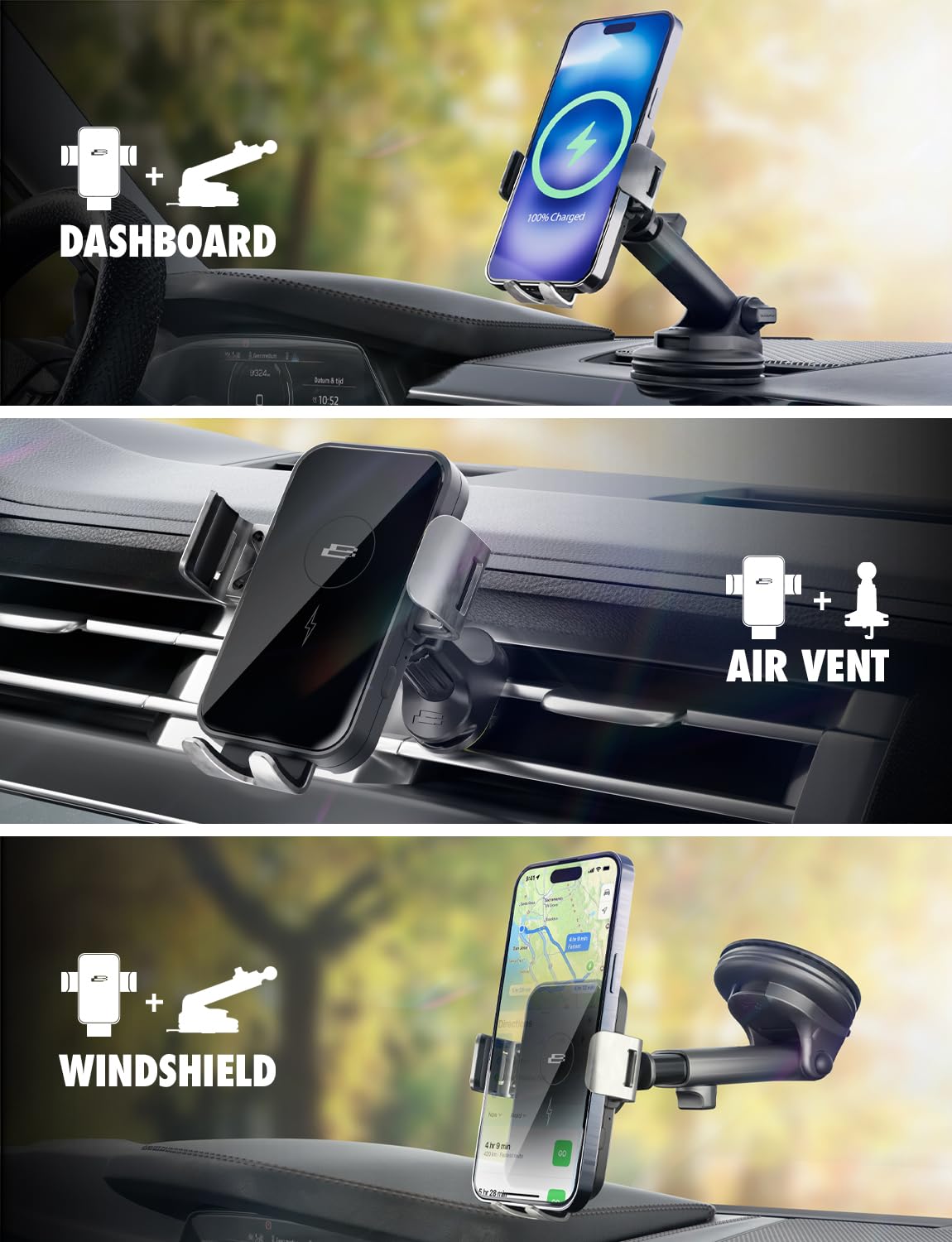 ADAPTABLE POSITIONING: With our car phone mount wireless charger, you can place your device in various locations, be it the dashboard, window, windshield, or air vent. This cell phone car mount charger has got you covered