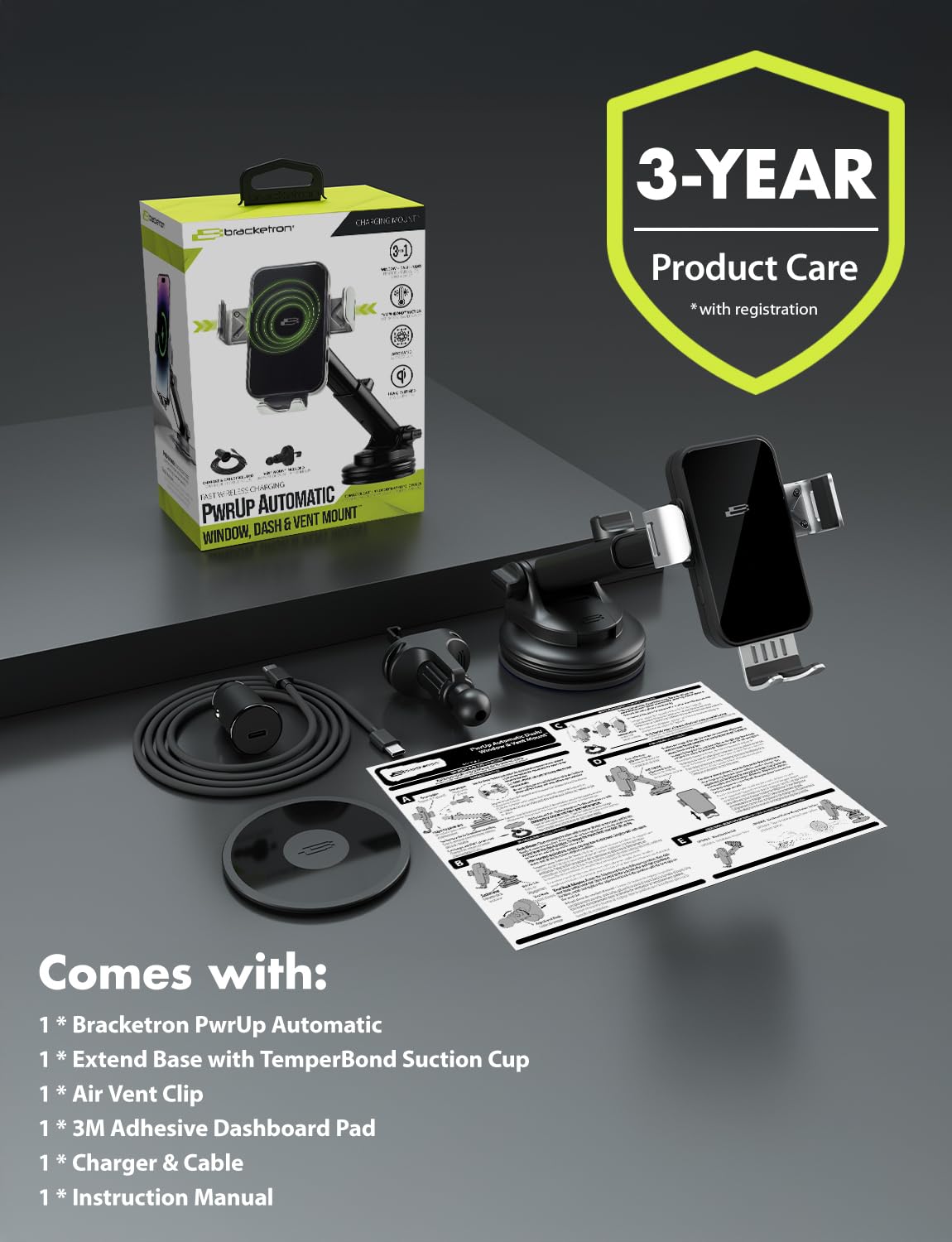 FAST CHARGING: Bracketron's car phone holder charger offers a 15W Qi-certified fast charging system. Never run out of juice, even with thicker cases up to 8mm when using the PwrUp car phone holder mount charger