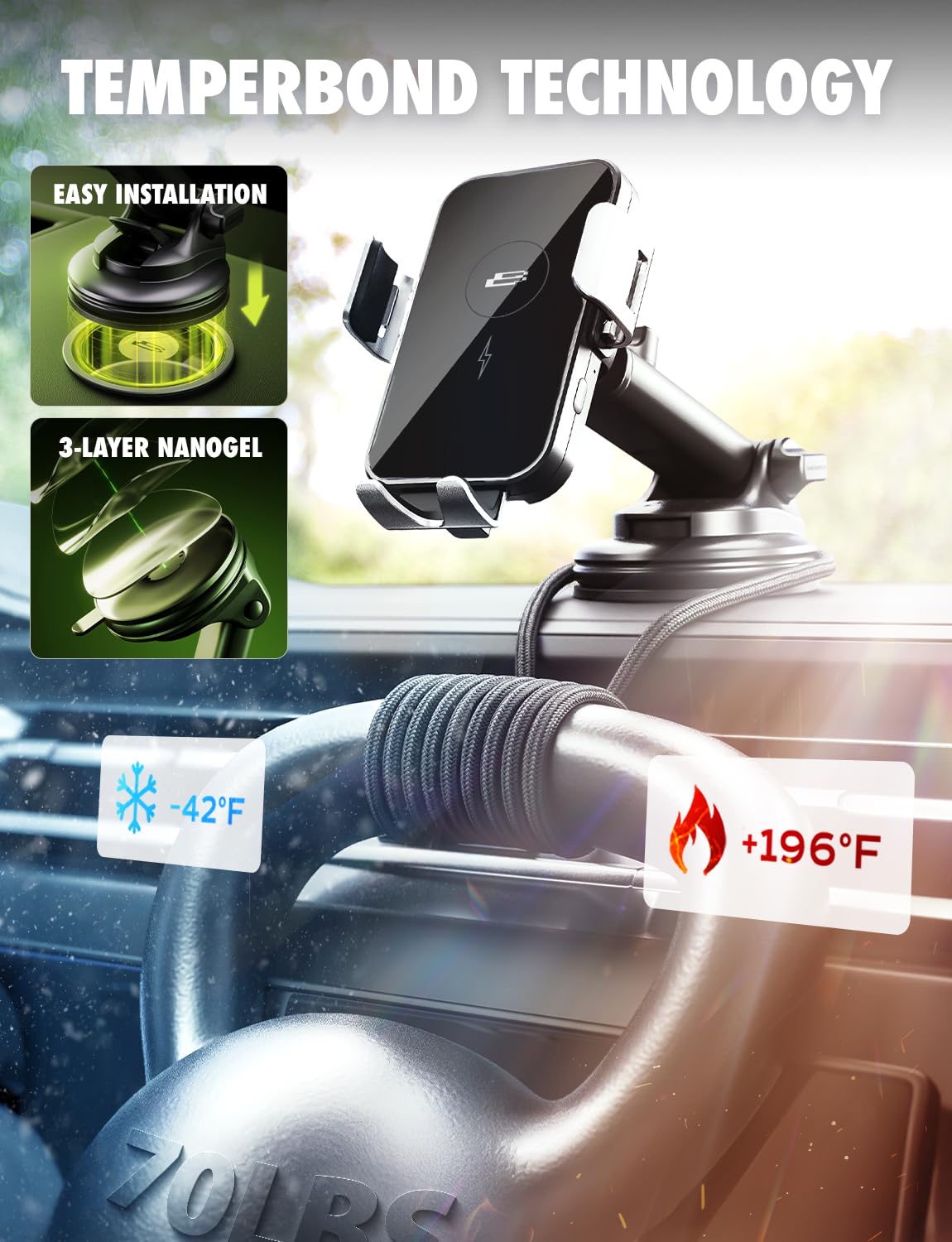 INSTALLATION TIPS: Always start with the standard method: mount the TemperBond suction cup directly to the windshield or a clean, flat dash. Avoid curved or uneven surfaces. Use the included 3M dash pad only if needed for textured dashboards or real leather (most dashes aren’t real leather). If using the pad, press firmly and wait 36–72 hours before mounting. Mounting too soon may cause it to peel. Always clean the surface with water or alcohol, no dust, oil, or protectants. If suction weakens, rinse with cold water and air dry to restore grip.