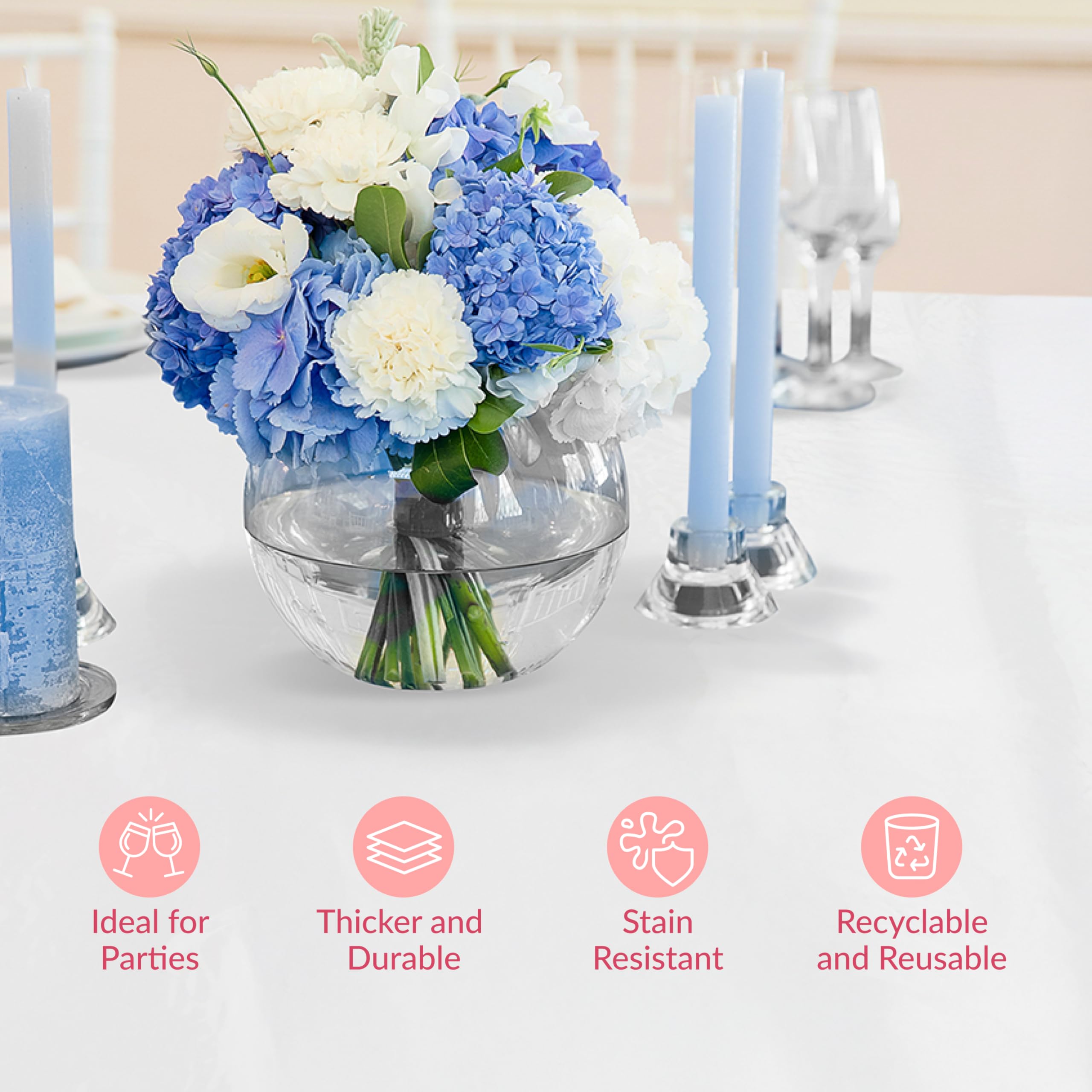 Waterproof and Easy to Wipe: Made from 100% waterproof plastic, this white plastic tablecloth repels spills and resists stains; a smart, mess-free option that eliminate the need for heavy-duty cleanup
