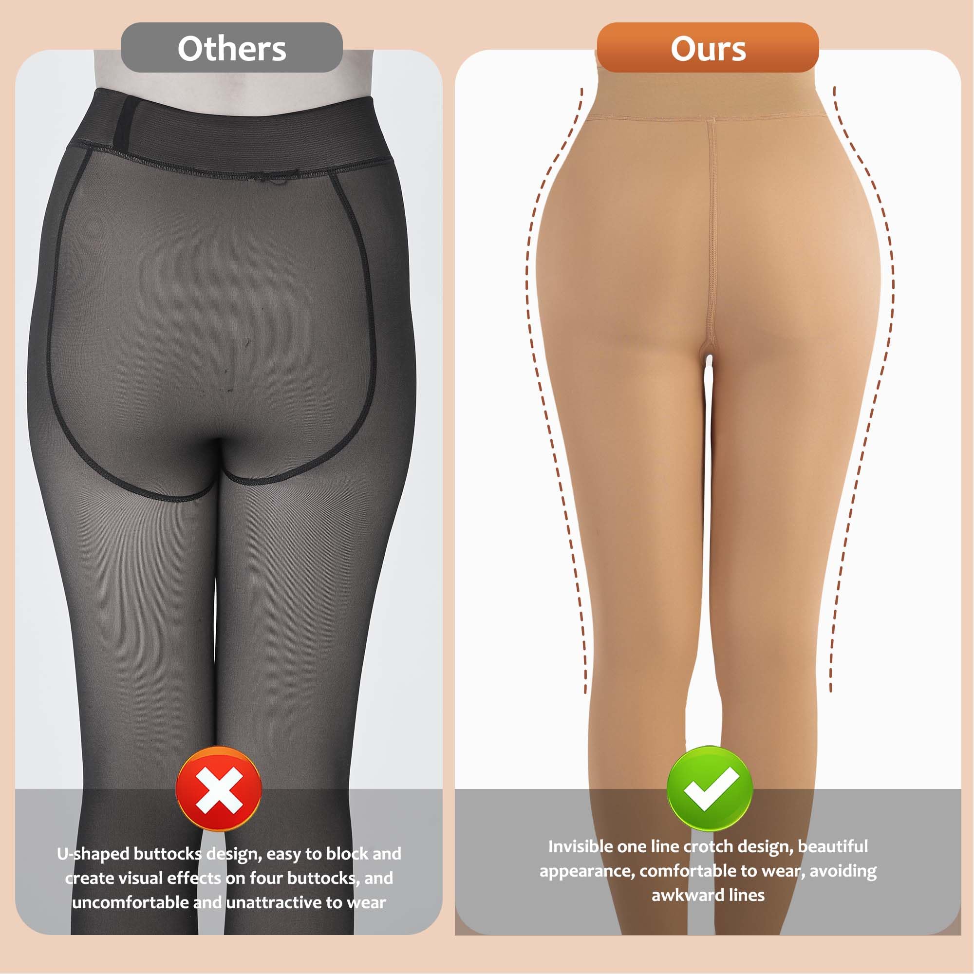 Invisible Crotch Design, Rejecting Awkward Threads: These fleece lined tights for Women Adopting an invisible one line crotch design,At present,the bottom pants on the market are all designed with U-shaped buttocks, which are easy to block and cause visual effects on four buttocks. Compared to this type of product, our bottom pants have a beautiful appearance and Avoiding awkward hip lines while highlighting hip curves when worn externally, making you comfortable and free.