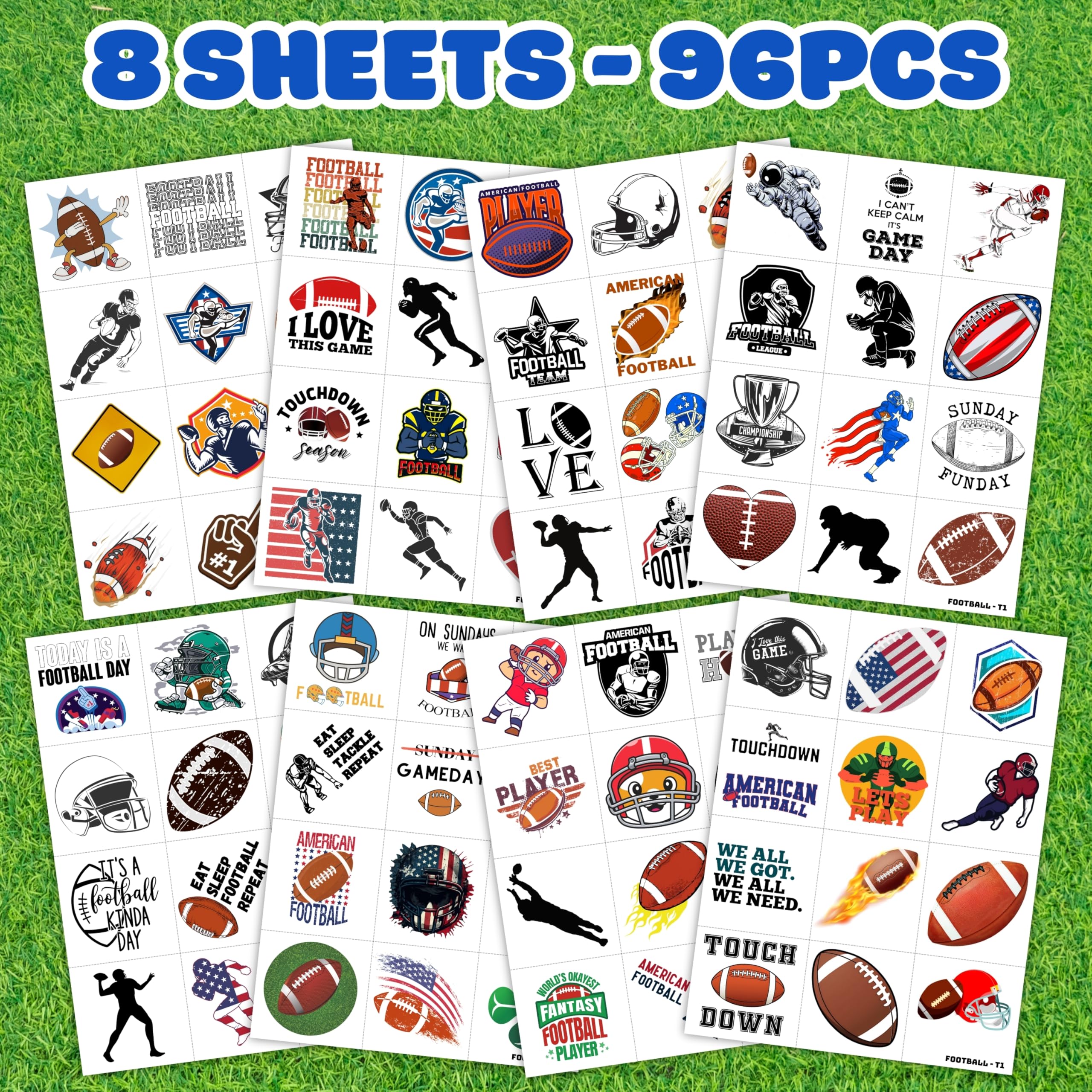 🏈【PERFECT PRE-CUT FOOTBALL TEMPORARY TATTOOS】: Our Football-themed pre-cut temporary tattoo stickers come with 8 pre-cut sheets, featuring 96 unique and adorable designs. Each sheet measures 16 x 12 cm (6.3 x 4.72 inches) and is perfectly sized for kids. Thanks to the pre-cut perforated lines, you can easily tear them apart by hand-no scissors needed! These tattoos are ideal for party favors and holiday-themed small gifts.