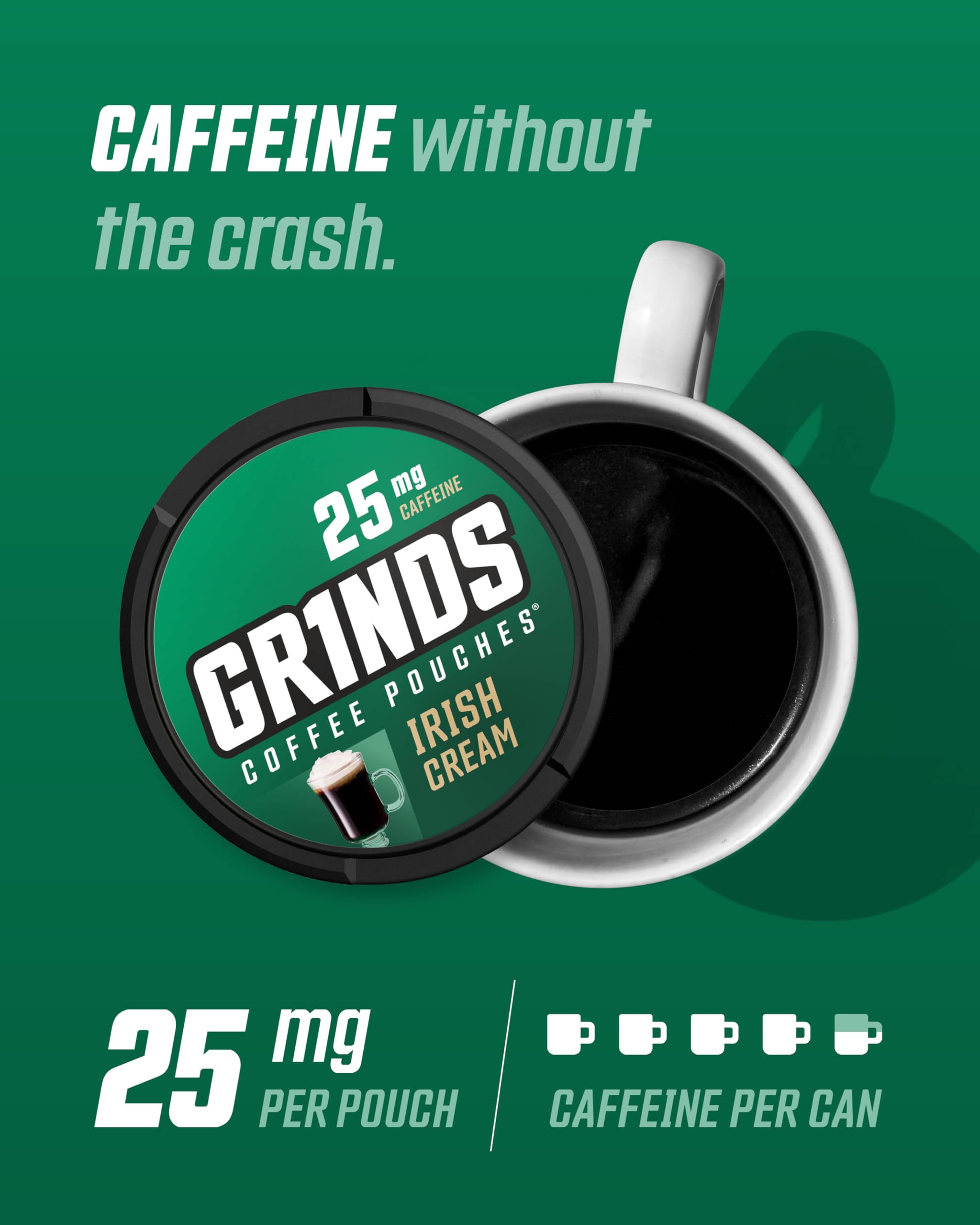 ENERGY BOOST: With 18 pouches per can, each coffee pouch pouch equals about 1/4 of a cup of coffee, or approximately 20–25 mg of caffeine, which makes each entire can of Grinds Coffee Pouches add up to the caffeine equivalent of 4–5 cups of coffee.
