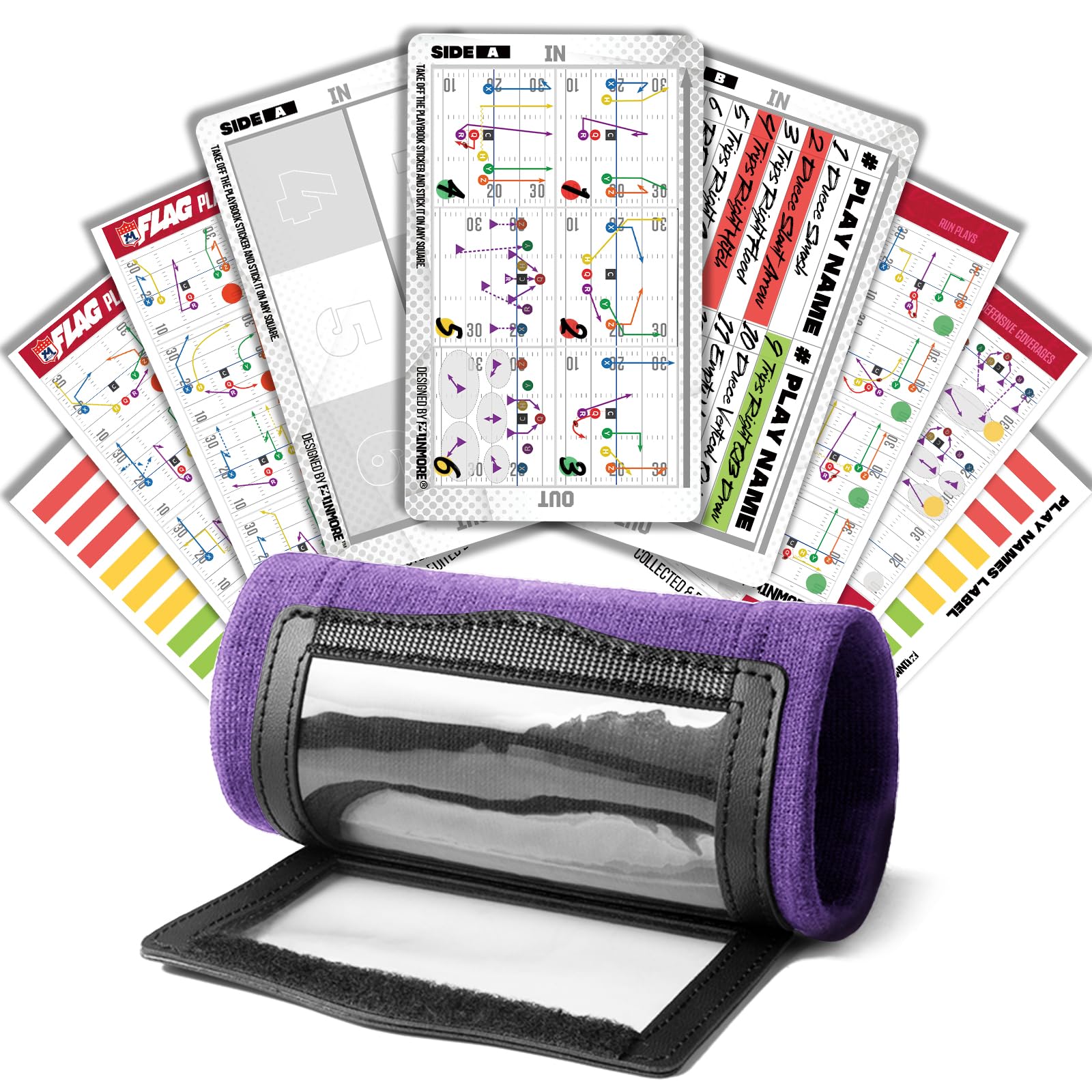 Play Coach Wristband - Includes Playbook System Each of our wrist bands comes with a playbook system that includes 43 common 5v5 flag football play stickers (covering offense, defense, and special teams) and 3 PVC play name cards. You can choose any tactic, peel off the play sticker, and directly stick it onto the card (up to 6 per card), allowing for quick and accurate use during the game. The back of the card supports handwritten play names, and you can use our provided colored stripe stickers to distinguish between tactics. Reliable Quality - The Choice of Players, QB and Coaches We have chosen a flat knit fabric with better elasticity and durability, a more transparent PVC window, and thicker PU material. The tighter stitching can easily withstand pulling during games. The waterproof performance is excellent; common paper print sheets of plays on the market are damaged by sweat after the game and cannot be used in rainy matches. In addition to the waterproof performance of the play stickers, the 3 PVC cards provided with each wrist coach are also waterproof. After the game, remove the cards, dry them, and the wristband can be washed with water. Simply reinsert the play cards into the wristband for reuse. Features 3 transparent windows Wristband dimensions: Width 3.5-7.08 inches, Length 5.5 inches Window dimensions: 3.8 inches x 2.4 inches Material: Cotton Applicable audience: Flag football players, quarterbacks and coaches Applicable age: 6 years old to adults (available in different sizes) We focus on providing professional play wristbands and will continue to develop more plays to meet the needs.