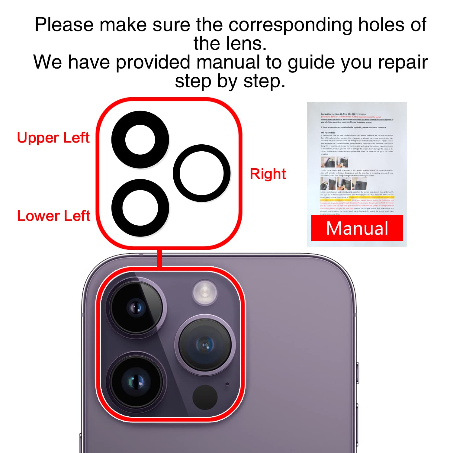 【Included Step By Step Installation Manual】Our iphone 14 Pro camera lens replacement repair set come with a detailed step by step installation manual to help you complete the repair process faster, reduce your time-consuming and increase the possibility of successful lens replacement. We also have 24 hours online after-sales staff to help you at any time. Instead of letting you go to YouTube to search and watch the video, because we insist on doing more for our customers!