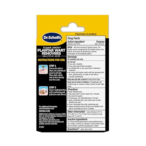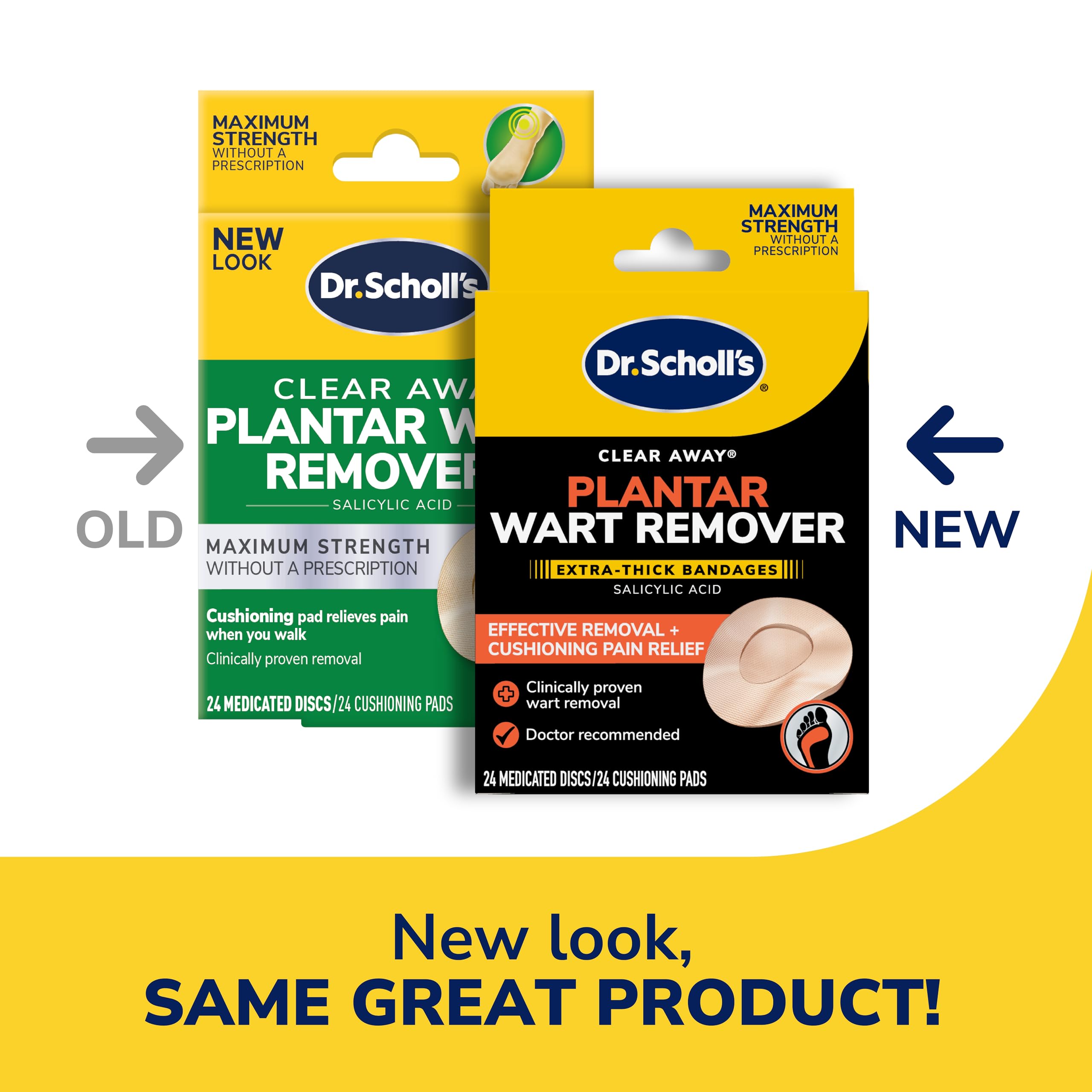 Dr. Scholl’s Clear Away Plantar Wart Remover Extra-Thick Bandages are clinically proven to effectively treat plantar warts on the soles of the feet, helping restore clear, healthy-looking skin. Specially designed for high-contact areas, these bandages stay in place and are shaped for everyday wear. The extra-thick cushioning helps relieve discomfort caused by pressure and friction, while the maximum strength formula delivers powerful wart-fighting action without the need for a prescription. Doctor recommended and trusted by feet everywhere, this treatment offers a convenient, at-home solution with discreet, multi-day coverage to support your plantar wart removal routine.