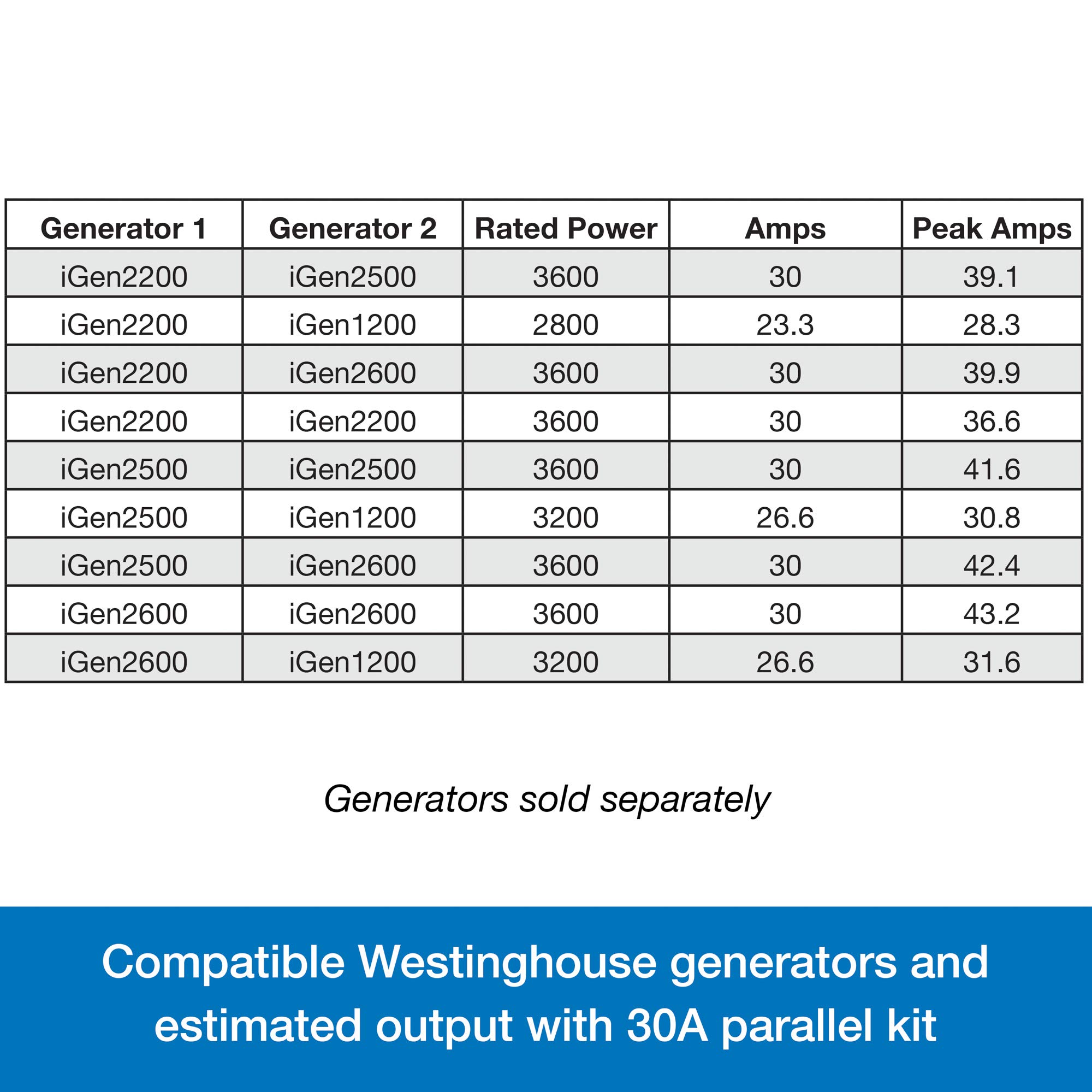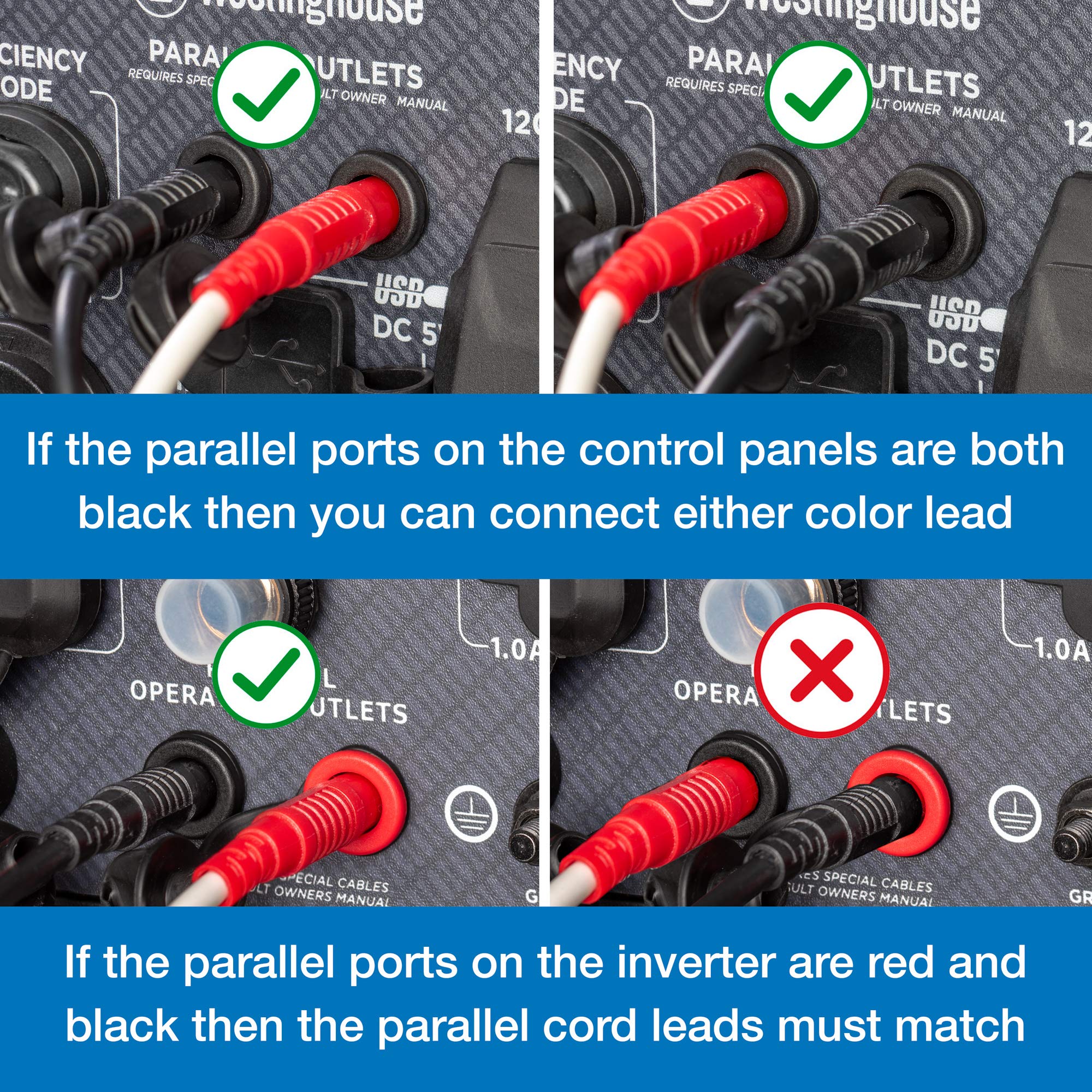 The Westinghouse 30 amp inverter generator parallel cord allows you to combine the power output of two inverter generators. Compatible with any Westinghouse inverter generator including the igen series as well as other branded models. This cord is able to cross model types to double the output for a higher wattage range.