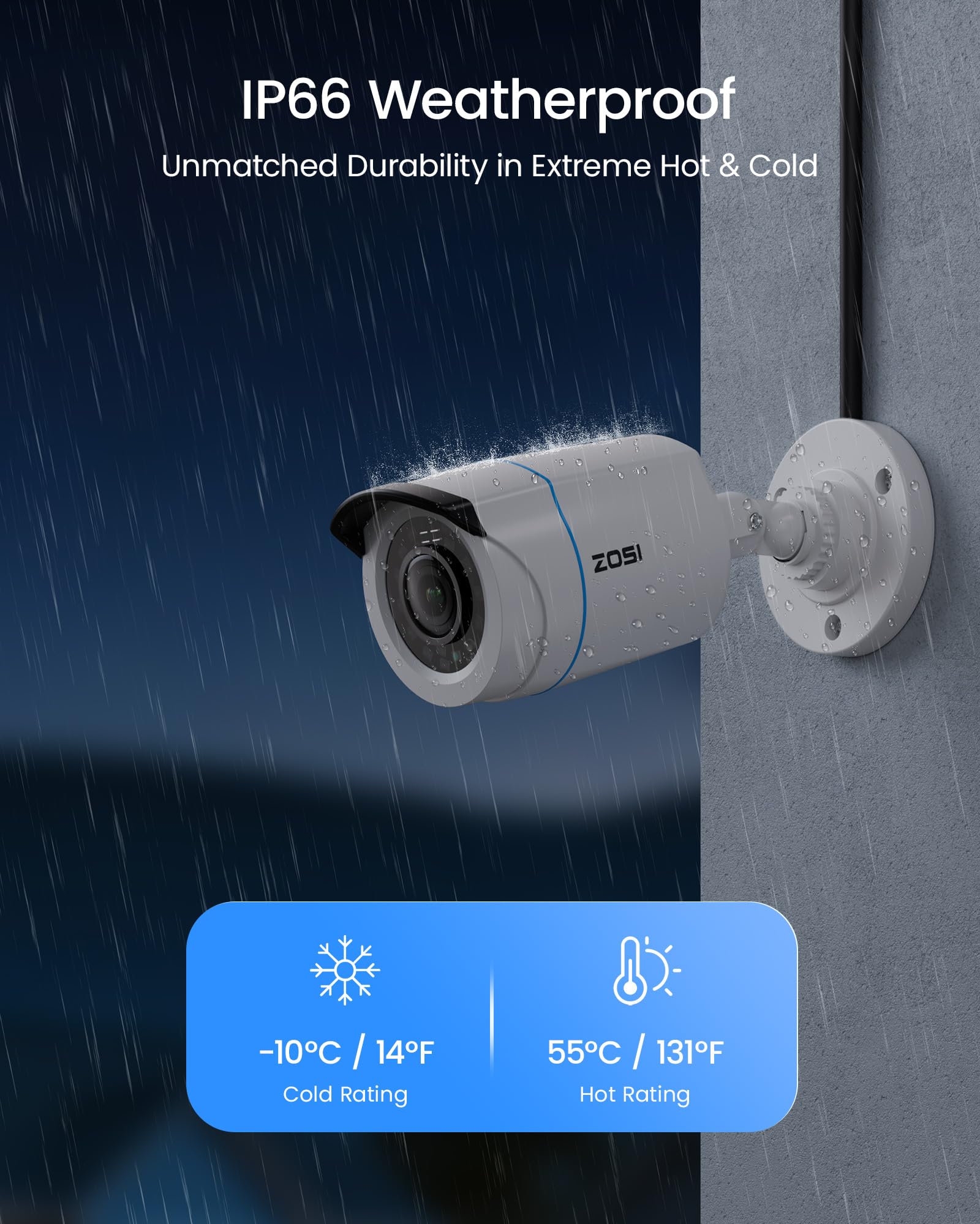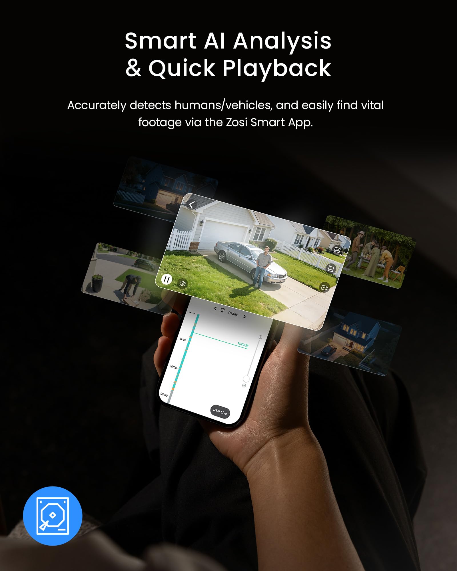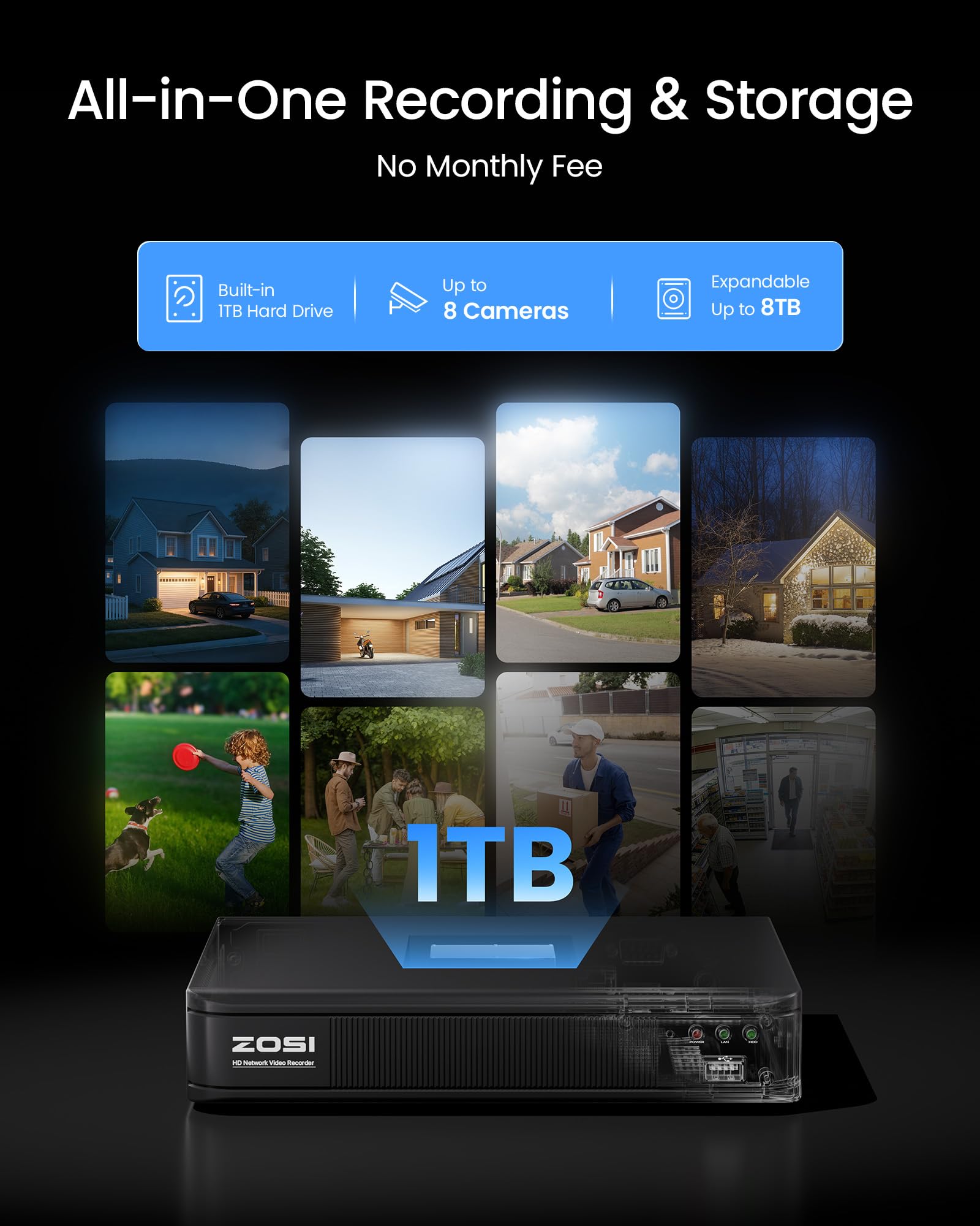 (5). [ Advanced H.265+ High Efficiency Video Compression ] __ ZOSI self-developed H.265+ video coding technology extract features that focus on characteristics of the surveillance scenes for larger storage space and better image quality. H.265+ can further improve compression ratio on the basis of H.265 standard and save about 80% storage compared with H.264, and thus effectively saving storage resources and provides an excellent and smooth viewing experience.