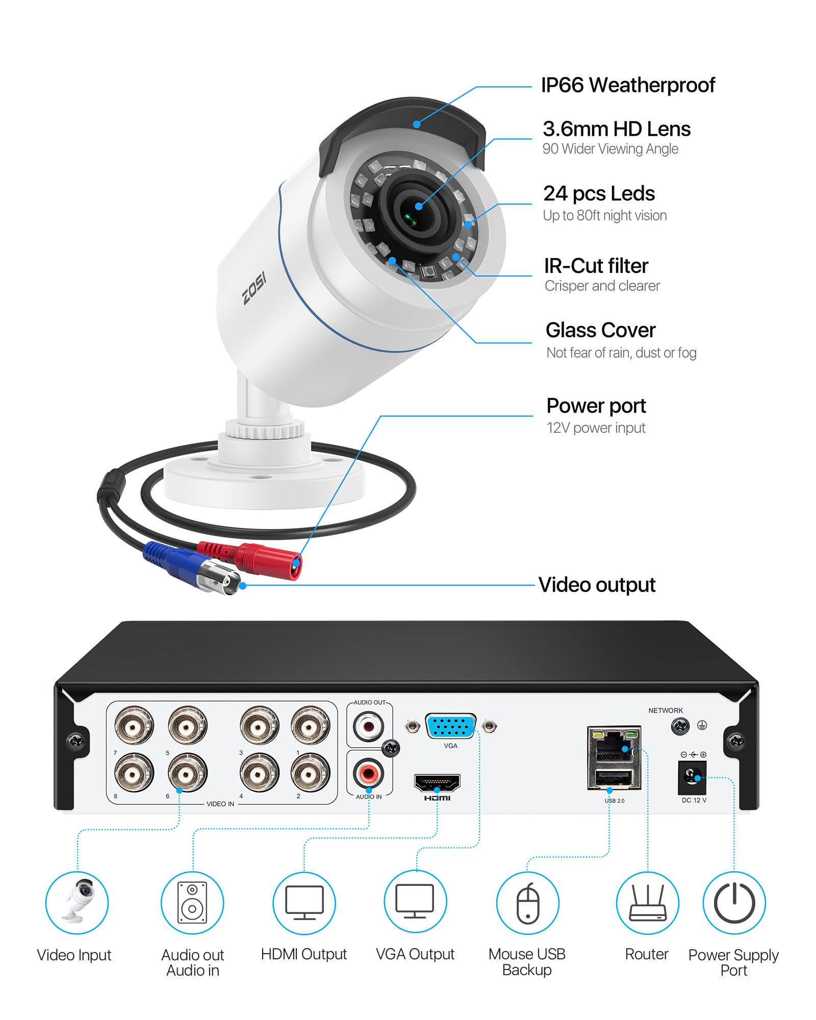 (2). [ 3K 5MP Lite Extendable System Overview ] __ Exclusive 8 Channel 3K 5MP lite DVR Recorder paired with 6 x Weatherproof 1080p bullet cameras with 80ft night vision and 90°view angle(It allows you to add 2 more cameras). 60FT BNC+DC CCTV cabling provides both video and power to your cameras,more stable and reliable than wireless security system.(1TB Security Grade Hard Drive Included)