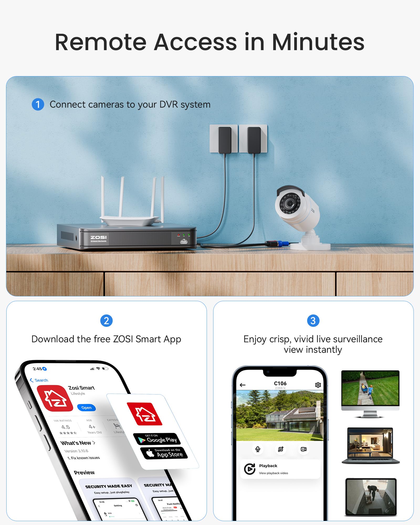 (3). [ Local or Remote Access, Playback Anytime & Anywhere ] __ View and control your security system locally by connecting the system to a monitor without internet, or via free ZOSI Client software on tablet, PC, or via Smartphone APP (ZOSI Smart ) on mobile devices remotely.You can also playback significant evidence or funny videos records by searching different days, hours or minutes.