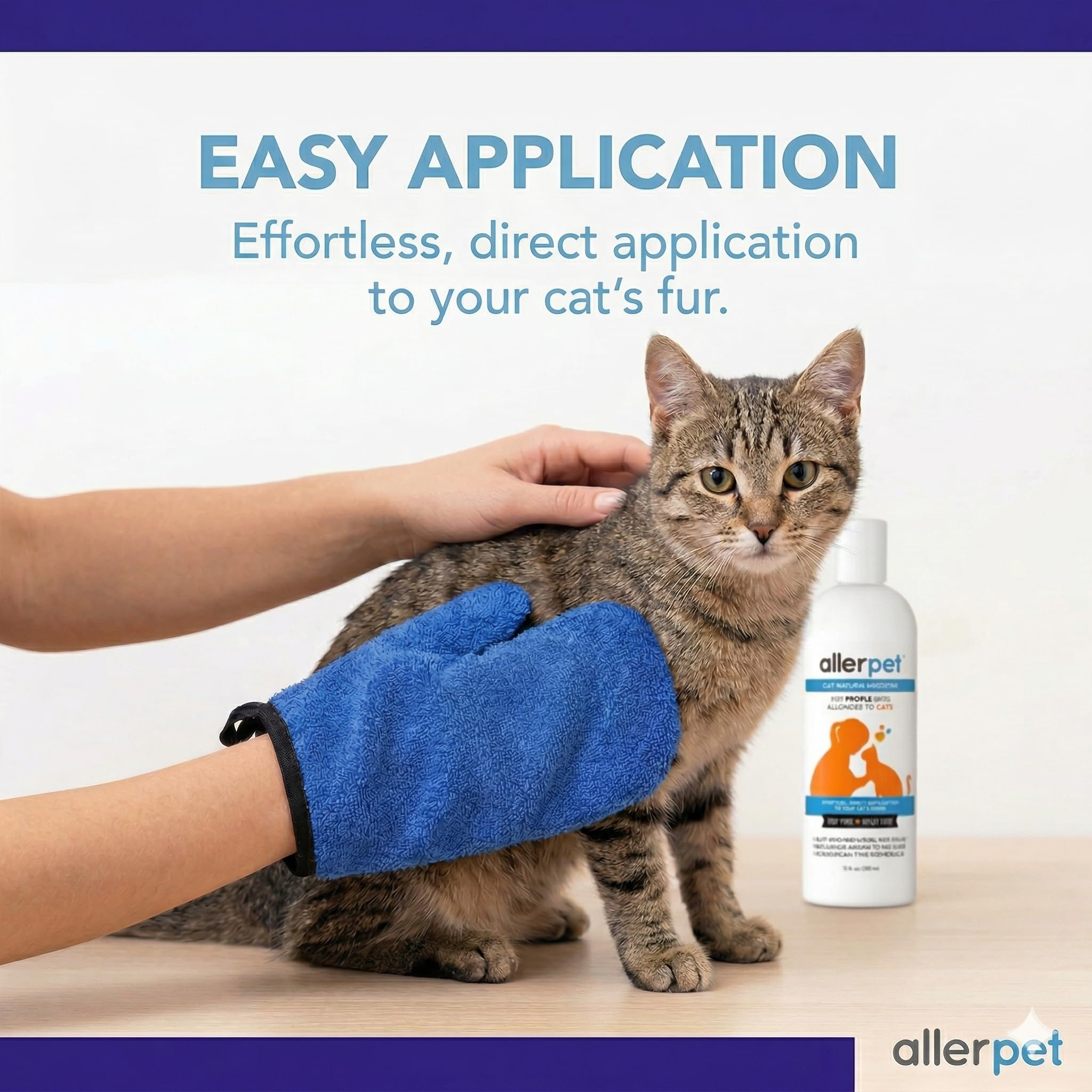 Easy Application with Mitt & Sprayer Options - Customers love how simple it is to apply Allerpet with our pet mitt & sprayer. The mitt allows for a stress-free experience for your cat, with the Allerpet application feeling similar to a good back rub. The sprayer is an additional option you can choose that reduces spills & mess, and allows for one-hand use while holding your cat. *Please do not spray the solution directly on your cat. Spray onto the application mitt first.
