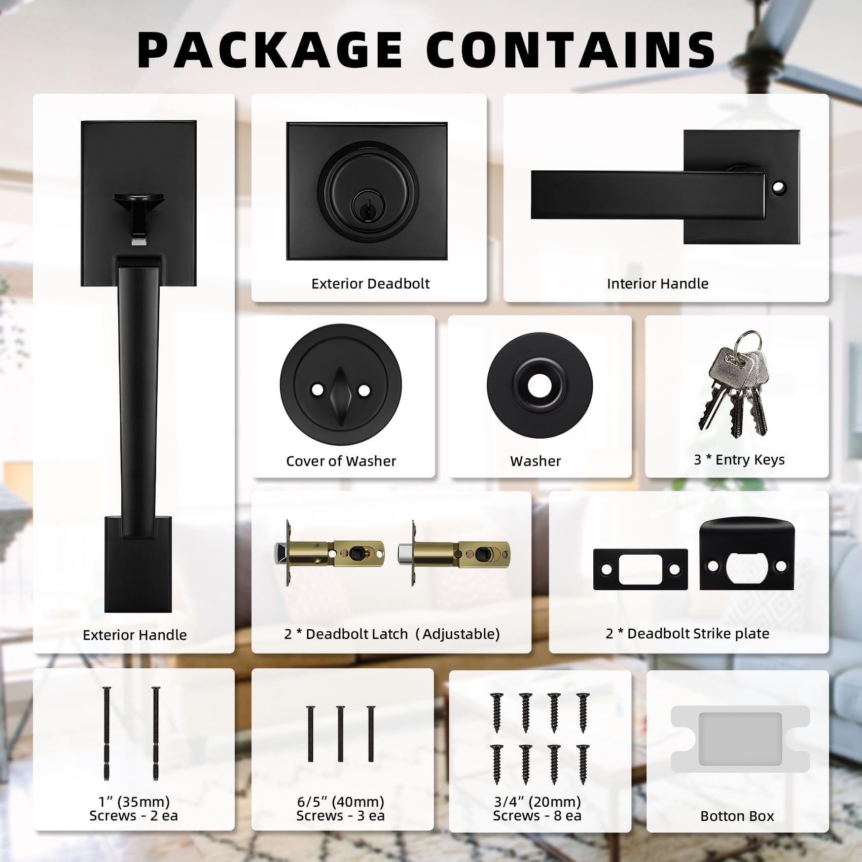 【Safety & Convenience】This exterior door lock set comes with a single cylinder deadbolt that can be opened by an exterior key, and have a secure lock inside, which provides dependable, security for your home. The black front door handle and deadbolt set includes all the necessary hardware components you need for an easy installation, including an installation instruction.