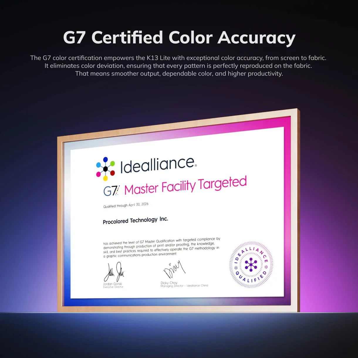 G7 Certified Color Accuracy: Pre-calibrated curves ensure consistent, vibrant colors from screen to fabric.