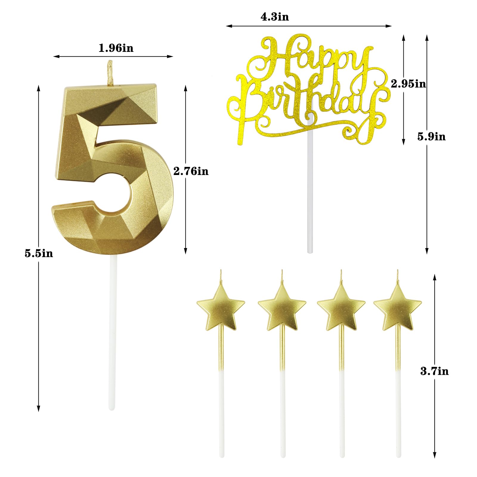 The unique diamond design and gorgeous metallic color of 3D diamond digital candles are suitable for birthday cake decorations of any size. With cute star birthday candles, it looks more unique and beautiful, full of joy. You can choose any number or combination of 0-9, such as 1, 12, 16, 18, 21, 39, 50, 60, etc. Flashing 3D digital birthday candles create unique and unforgettable surprise moments or anniversaries for your birthday party in the dark! product information: Ingredients: environmentally friendly paraffin wax Number birthday candle: 5.5 inches high, 1.96 inches wide, and 0.47 inches thick. Weight: 23g Star birthday candle: 3.7 inches high, 0.11 inches wide, and 0.35 inches thick. Weight: 3g amount of goods: Number birthday candle*2 Star birthday candle*4 Color: Gold | Size: 55 Reminder: Please do not leave lit candles unattended. Keep candles out of the reach of children. Do not place candles on or near flammable materials. Guarantee: Our customer service will provide you with service at any time. We promise to return and exchange unconditionally, and high-quality products and services are our top priority.