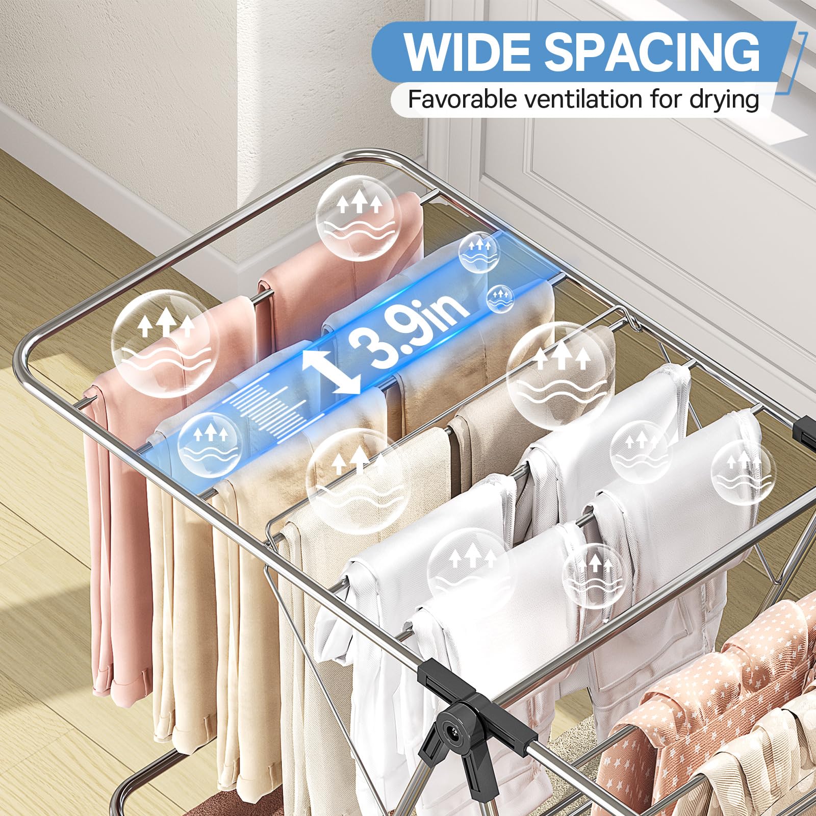 Height Adjustable: Our clothes drying rack has 4 wings that can easily adjust the height to accommodate clothes of various lengths. The 3.9-inch spacing design allows clothing to be ventilated, breathable, and dry faster