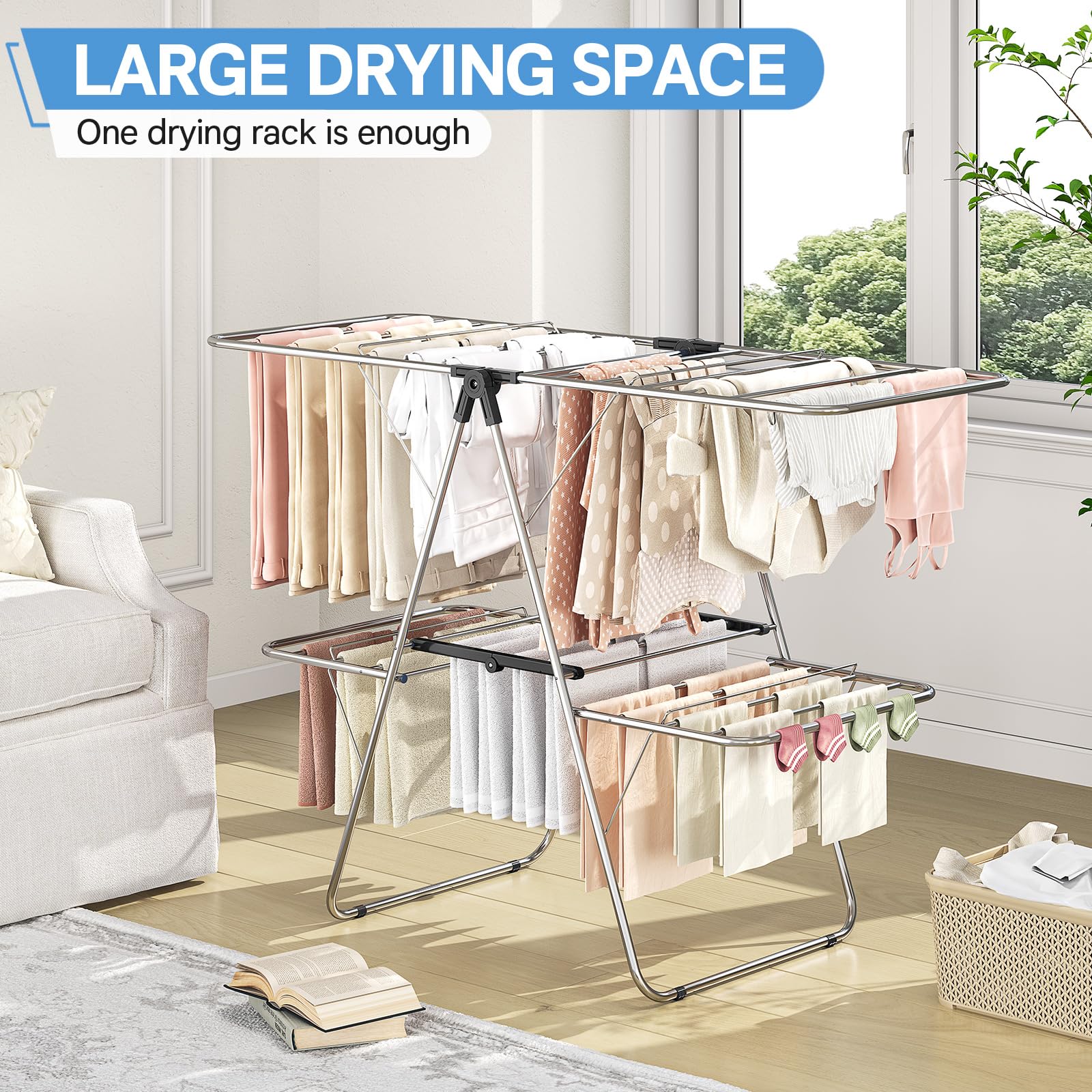 Large Drying Space: Our drying rack is divided into two layers and four wings. The upper layer is 56.5 inches wide, making it easy to dry large bedding. The lower layer is designed to hang smaller items such as socks and towels, providing a spacious drying space for the whole family!