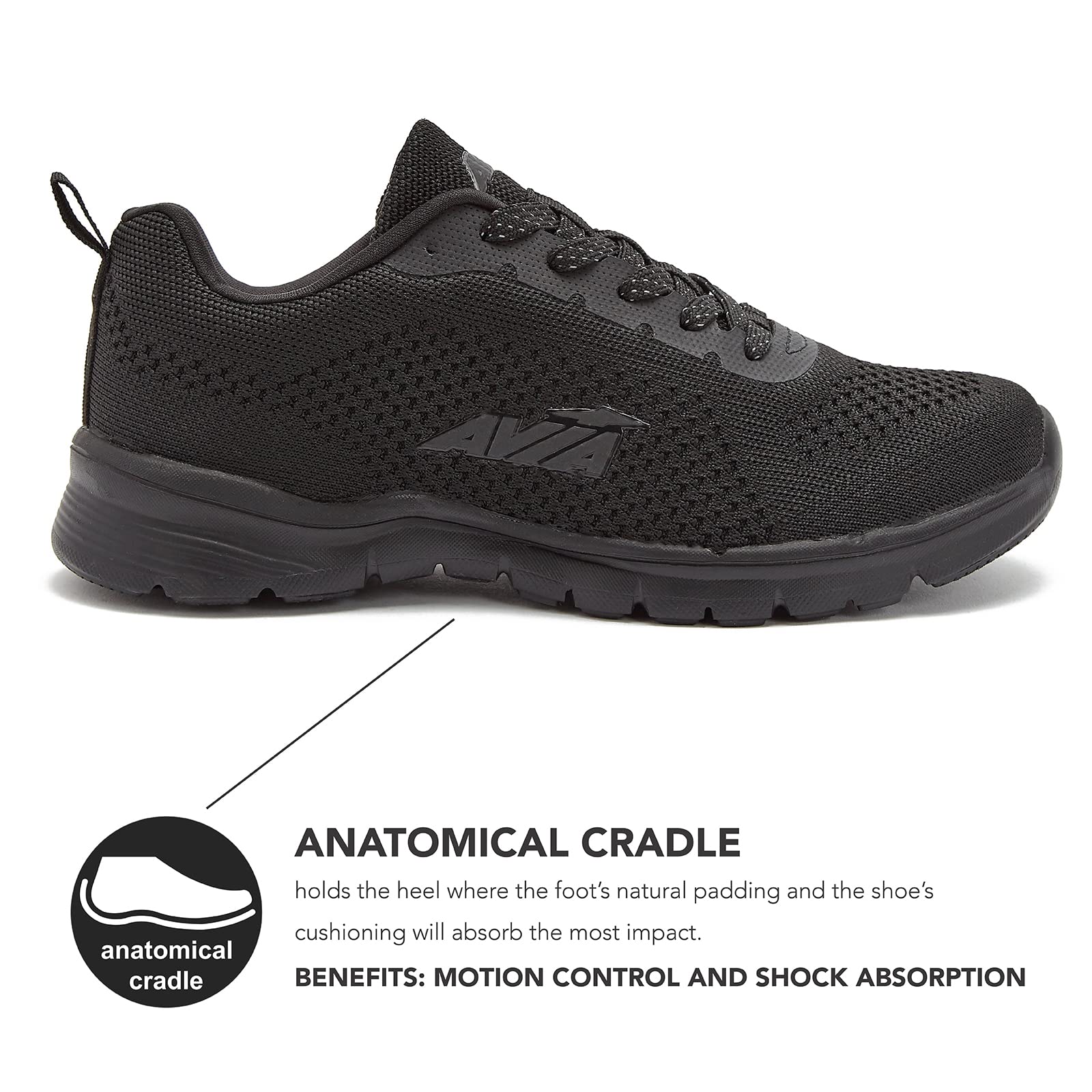 ANATOMICAL CRADLE FOR MOTION CONTROL - The Avia anatomical cradle holds the heel where the foot’s natural padding and the shoe’s cushioning will absorb the most impact.