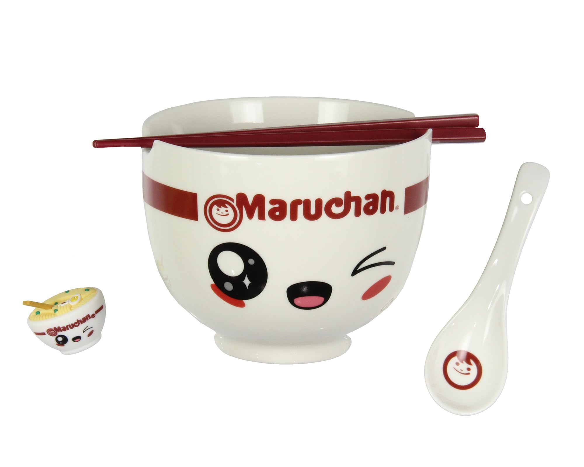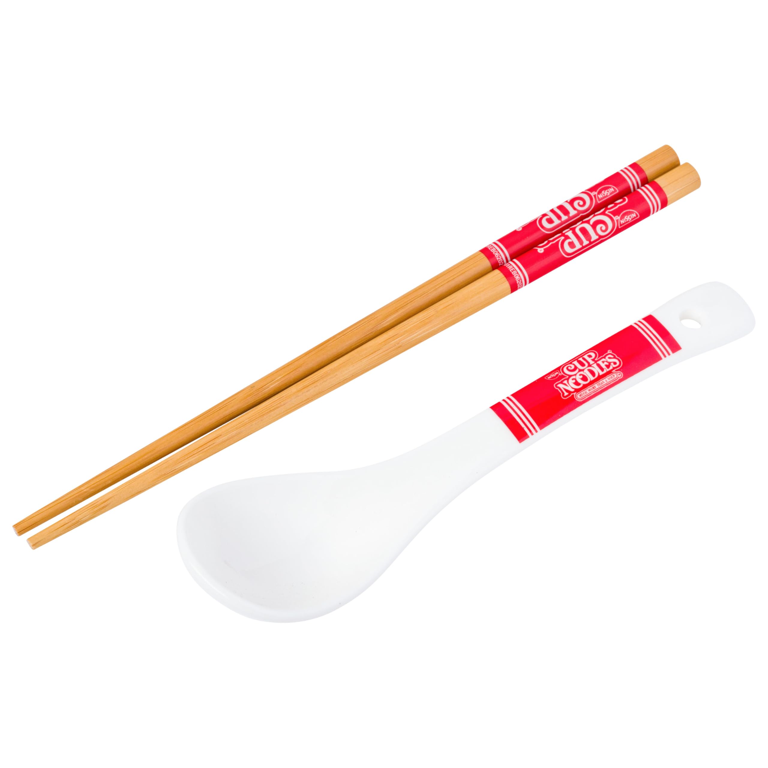 CUP OF NOODLES BOWL SET: Themed bowl set includes a ceramic bowl featuring the Cup of Noodles logo. Written on the front of the bowl is the Cup of Noodles slogan, “Much More Than a Soup.” Matching spoon and chopsticks also feature the iconic logo.