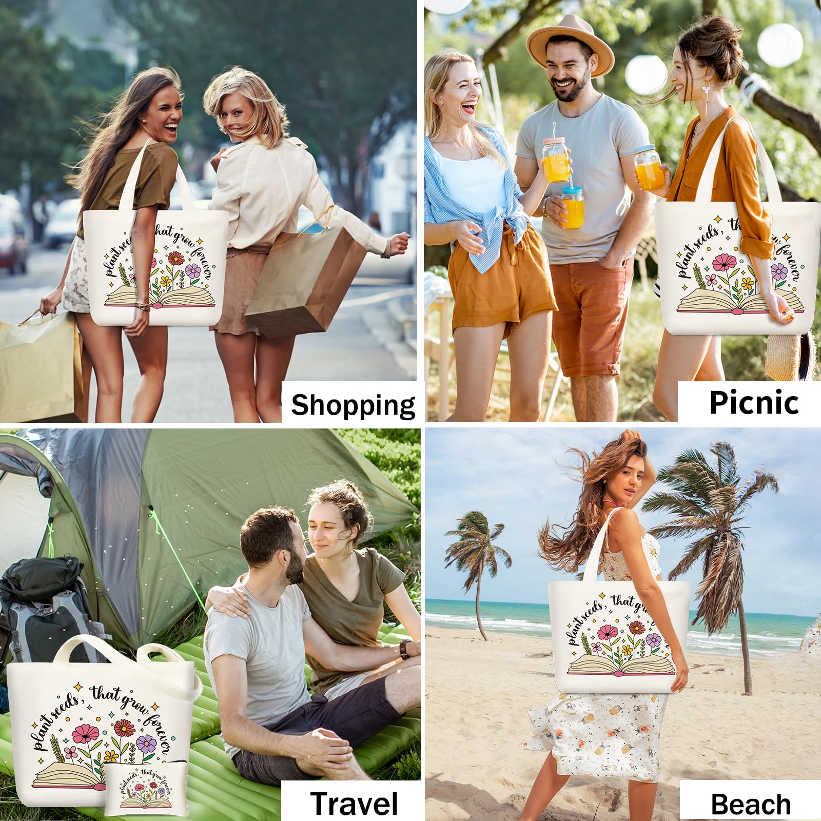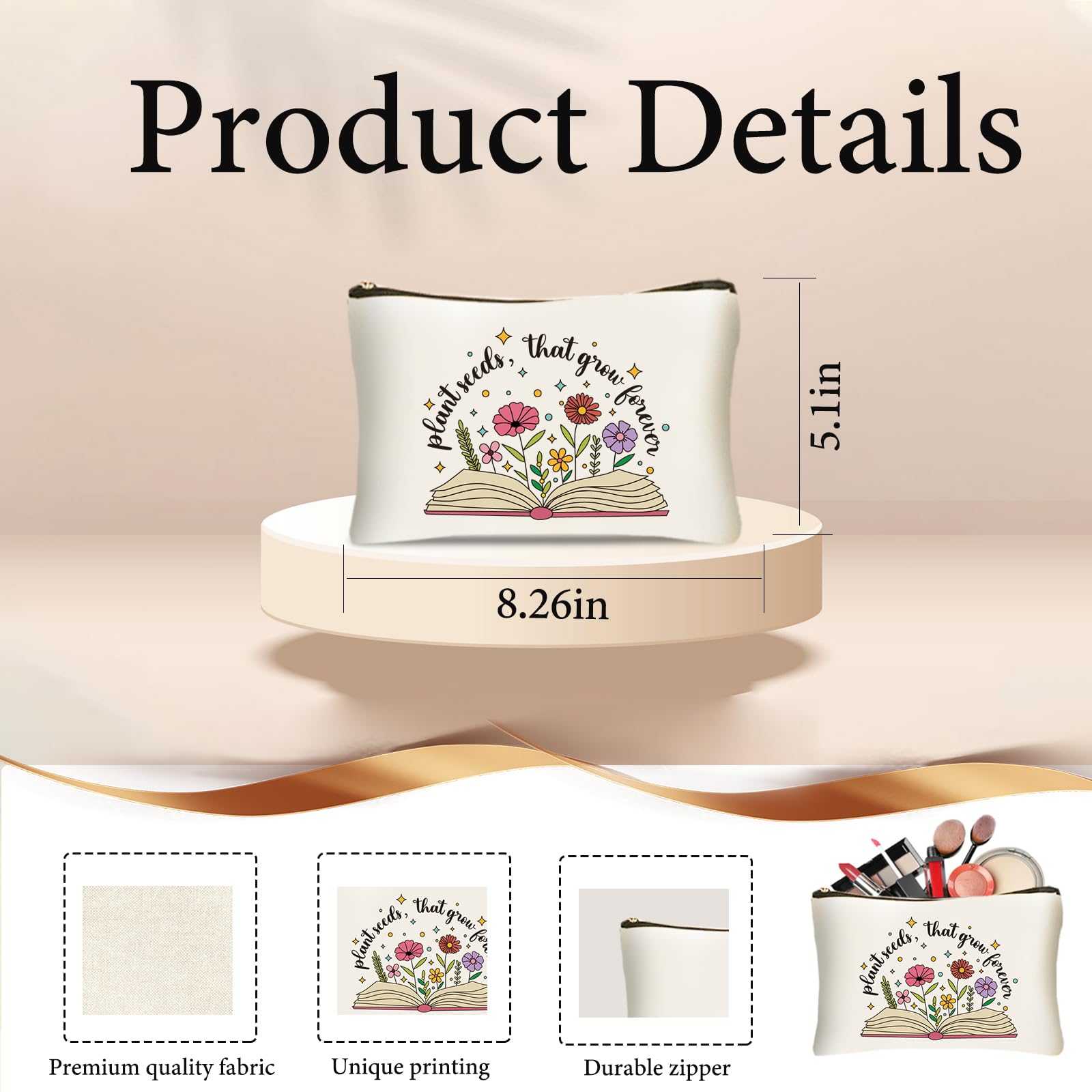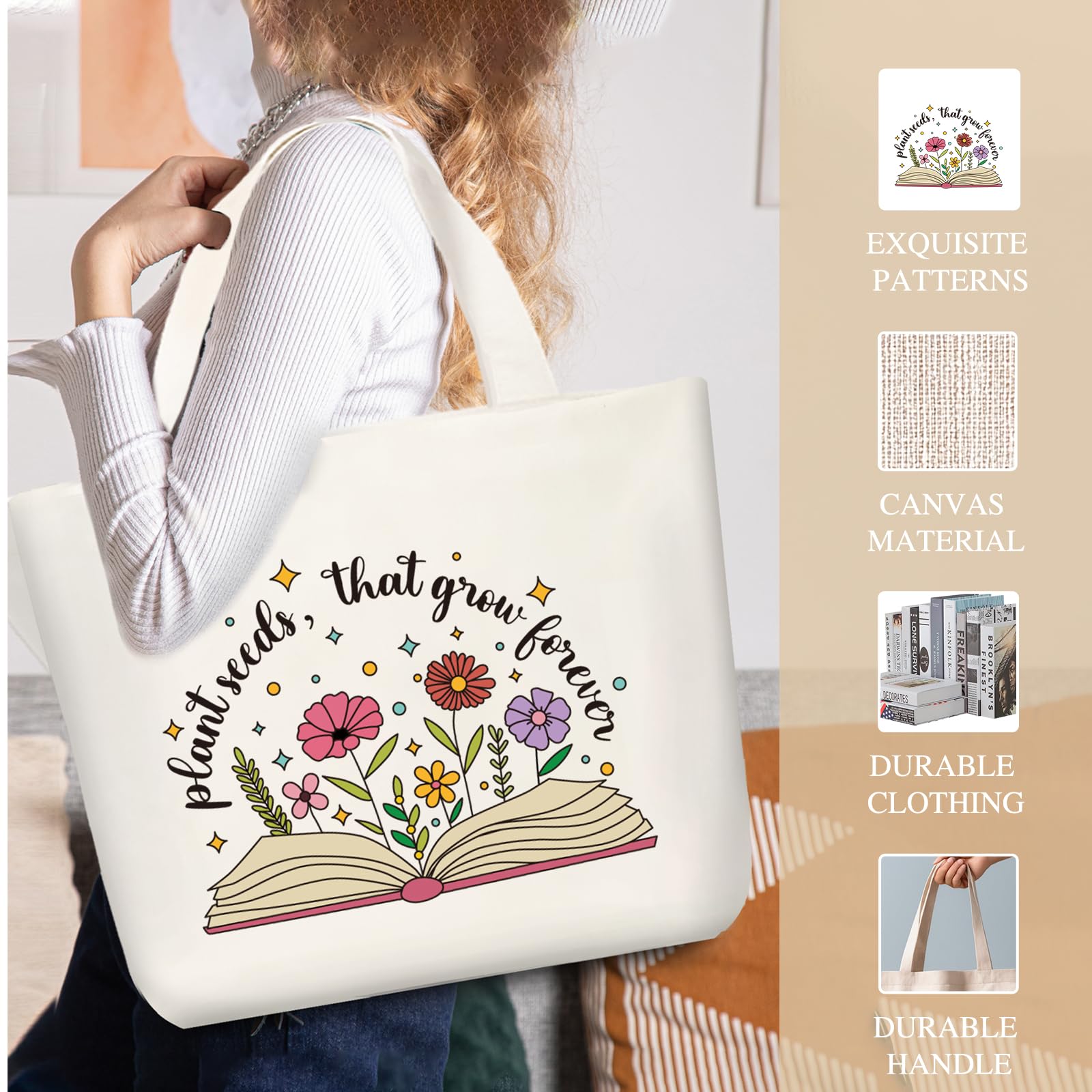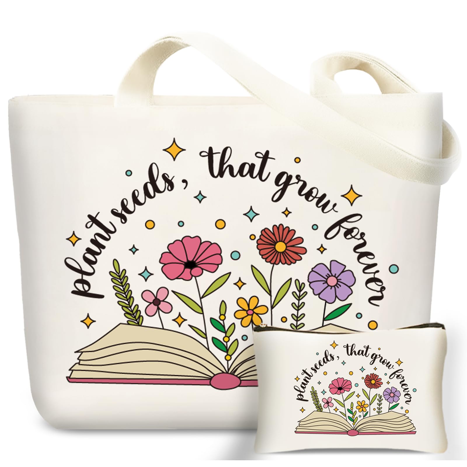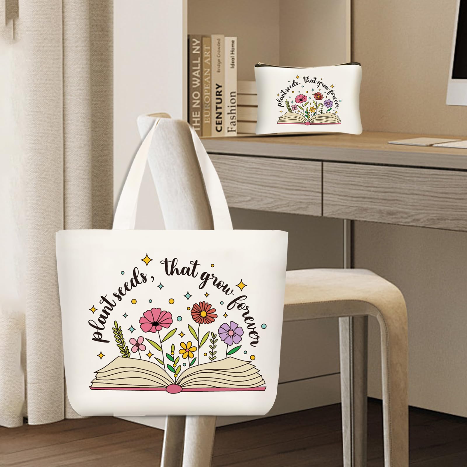 Teacher Canvas Tote Bag: With the theme of “Plant seeds, that grow forever”, this tote bag is full of art and literature with open books and colorful flower patterns. The premium quality canvas material is sturdy and durable, making it a stylish companion for teachers on their daily trips