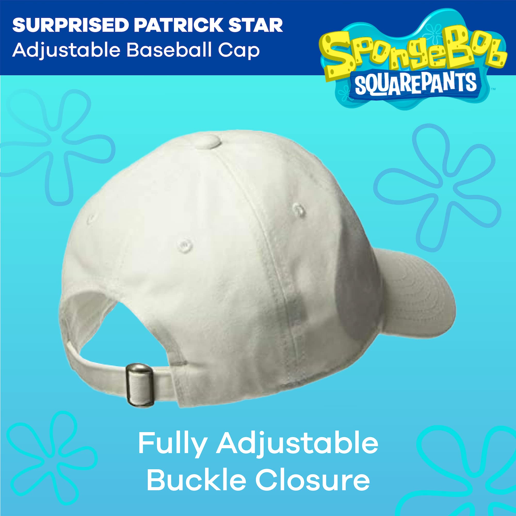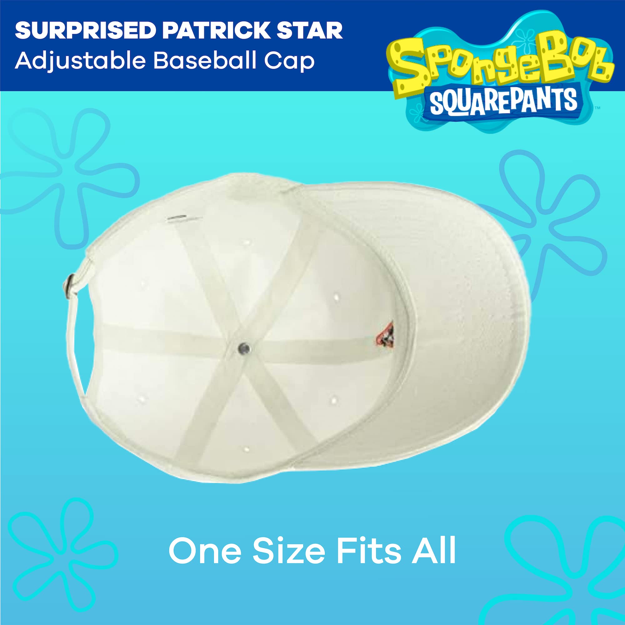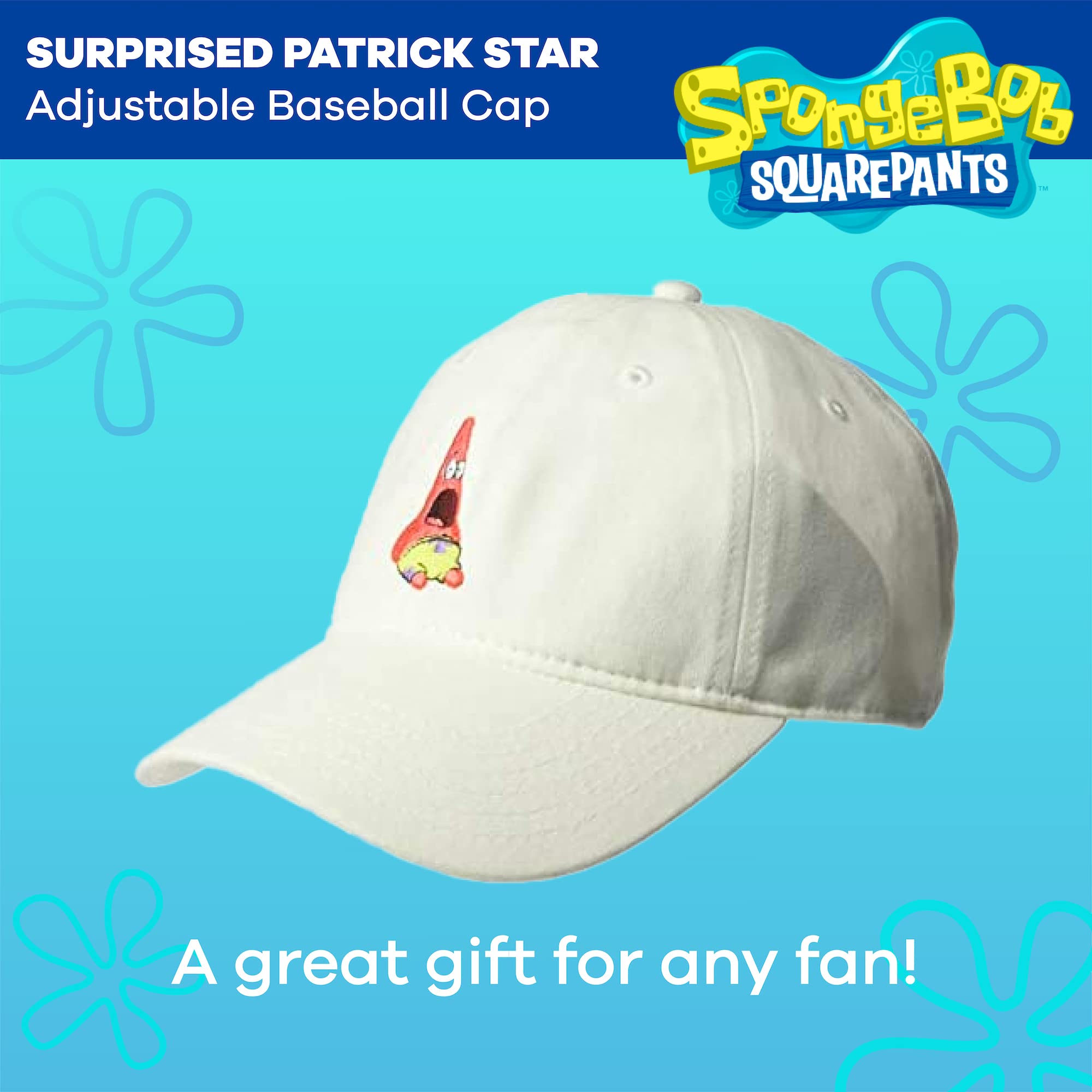 PATRICK STAR BASEBALL HAT: White cotton adjustable dad hat with an embroidered image of Patrick Star's internet-famous shocked expression