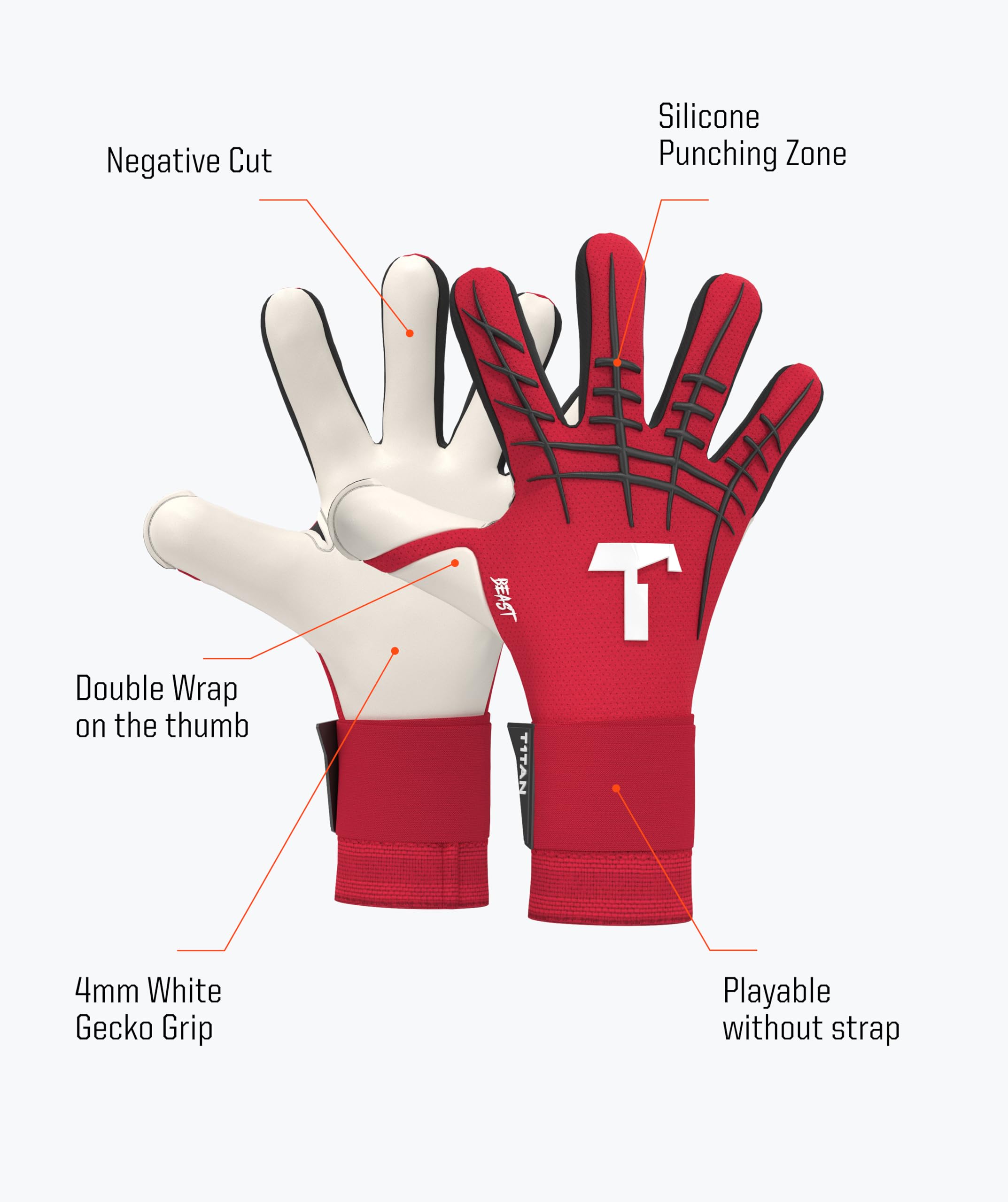 Hit back and beat the best: the T1TAN RED BEAST 3.0 are a real weapon in the box. Mega grippy 4mm Gecko Grip. Negative Cut. Extra tight Fit. Extended Grippy Foam. Completely new developed silicone punching zone in cool Beast look. Breathable Mechano 2.0 material. Removable straps. Irresistible RED BEAST look in eye-catching signal color.