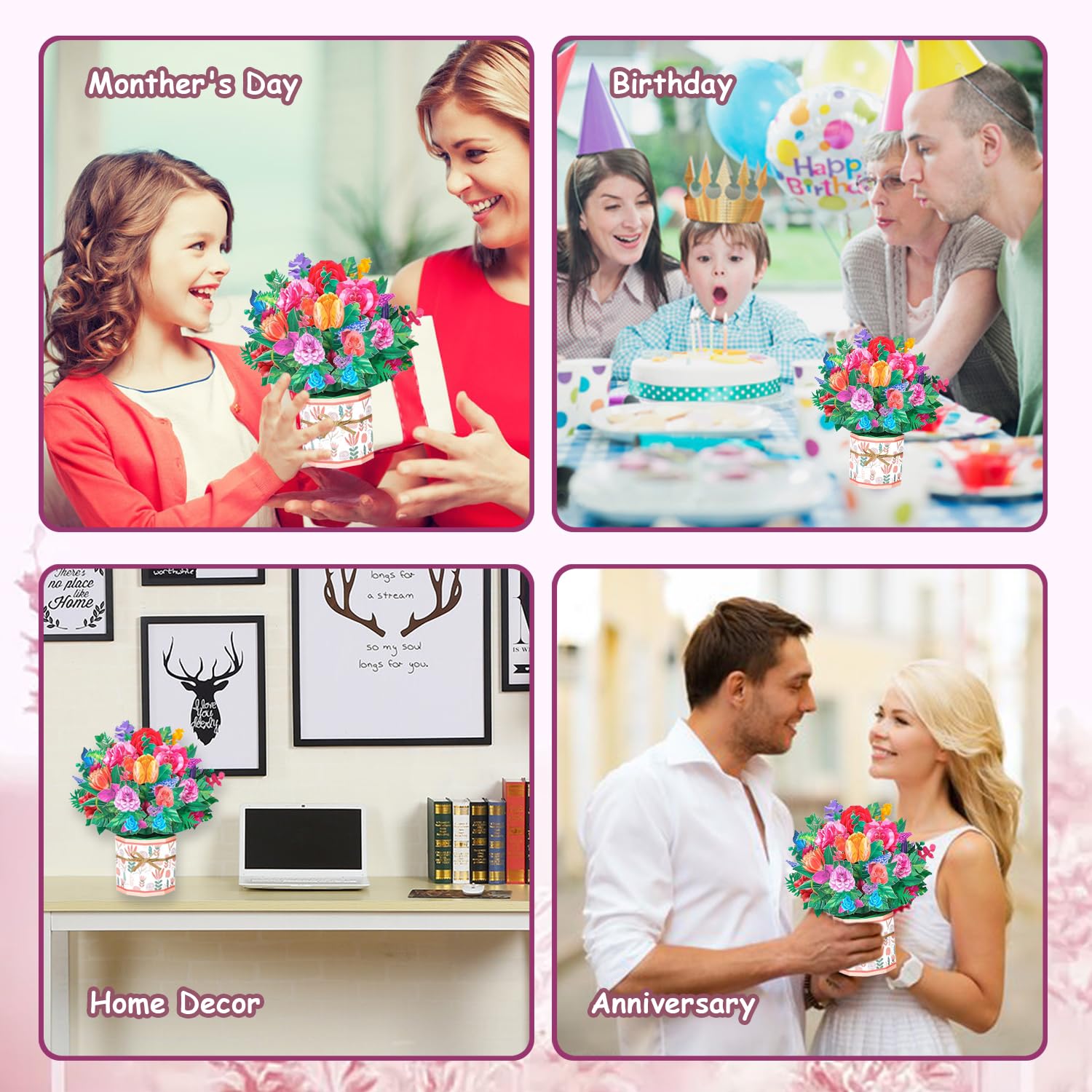 Creat A Moment of Surprise: With the 3D rose carnation bouquet design, when open it, pop up a bunch of beautiful paper flowers. The receipiant will be touched and delighted by this card. This flower greeting card is exquisite and unique, perfect for your loved ones. This pop up flower card is more than just a present, in fact this piece of art will be long lasting memories worth cherishing.