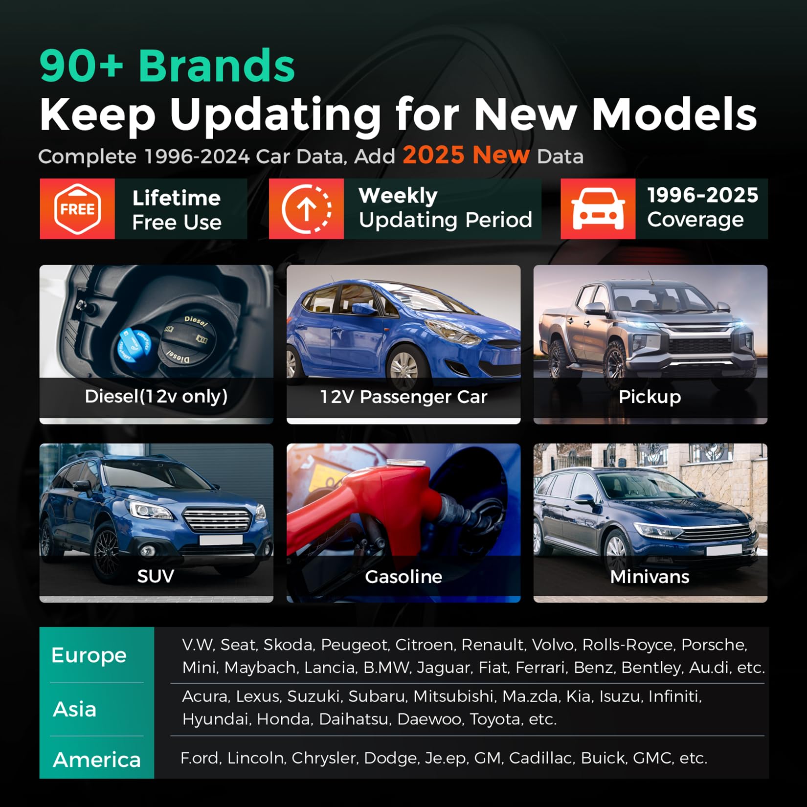 [FCA AutoAuth &Free Updates for Lifetime]. LAUNCH CRP123X provides no-fee upgrades. Continually enhance vehicle diagnostic software, can diagnose 1996-2025 vehicles with a massive global vehicle database. With integrated AutoAuth, diagnose 2018+ FCA SGW-equipped cars.Yearly functional upgrades ensure CRP123X purchased years ago to keep up with newer diagnostic advancements. Beyond that, we'll always be working on behind-the-scenes bug fixes to drive your scan tool in excellent condition.