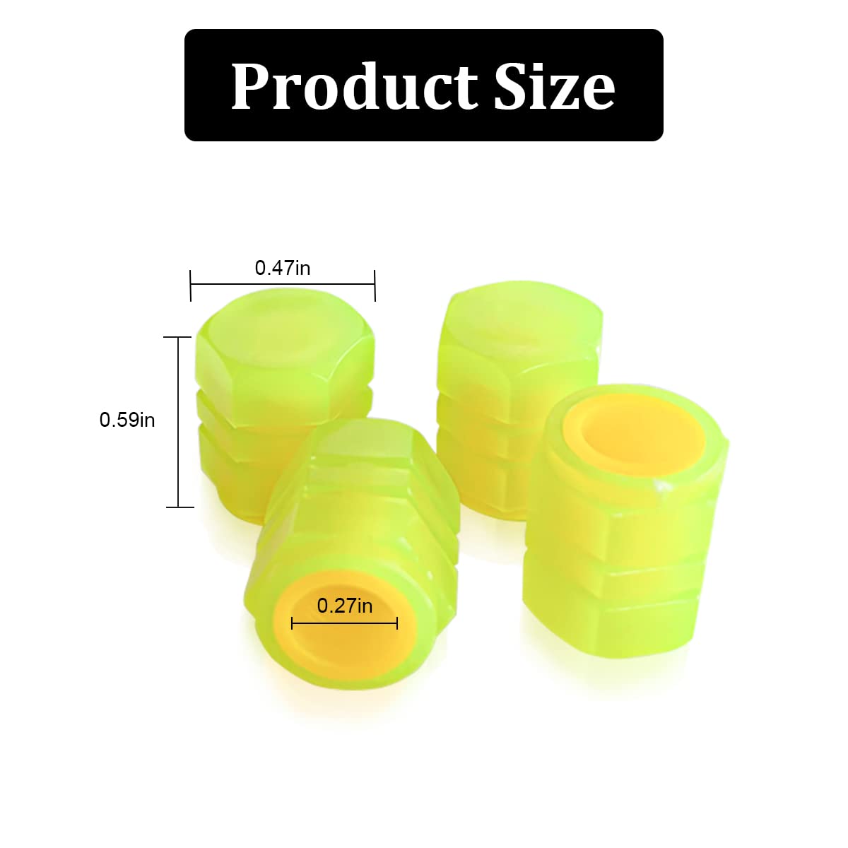 - Product name: Universal fluorescent car tire valve cover - Material: ABS - Color: Yellow / Pink / Red - Height: 16 mm - Outer diameter: 12 mm - Inner diameter: 8 mm - Package Contents: 12×Universal fluorescent car tire valve cover Note: - Since the fluorescent material needs to absorb the light source, it glows at night. Stem caps do not absorb light sources when stored in airtight packaging for extended periods of time. Illuminate with LEDs or place them in sunlight for 4-6 hours before using fluorescent stem cpas for the first time.