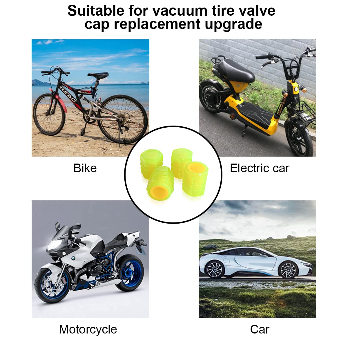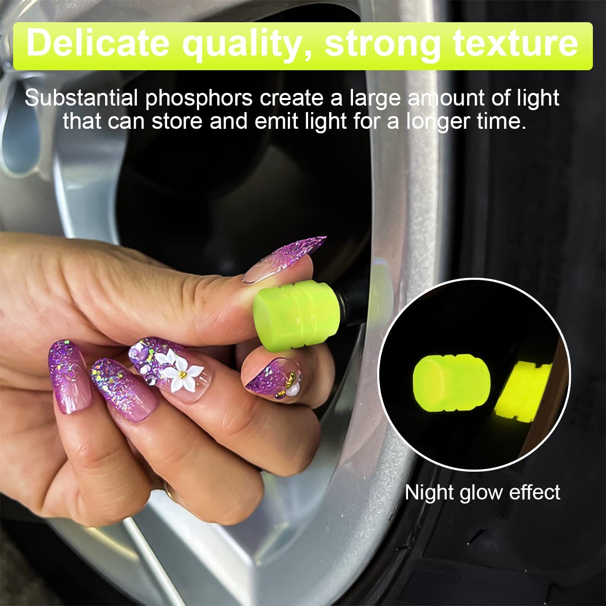 【Universal Size】: This tire valve cover has a standard size and fits more than 95% of cars, pickup trucks, SUVs, motorcycles or bicycles. Note: Since fluorescent material needs to absorb light source, it will glow at night. We recommend that you illuminate the fluorescent valve cover with LEDs or leave it in the sun for 4-6 hours before using it for the first time.