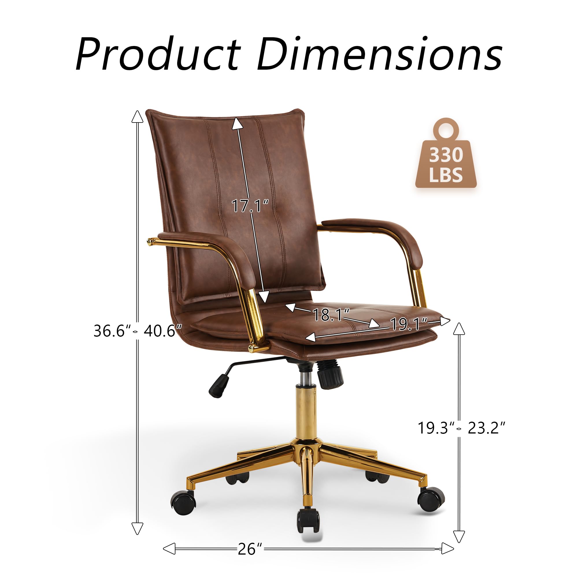 PRECISE MEASUREMENTS: The 360-degree swivel gold office chair has overall dimensions of 22"W x 17"D x 34.2-38.4"H, seat dimensions of 17.5"W x 17.5"D, and can hold up to 300 lbs. The chair's tilt angle can be adjusted from 90 to 105 degrees and locked for various work or relaxation seating positions.