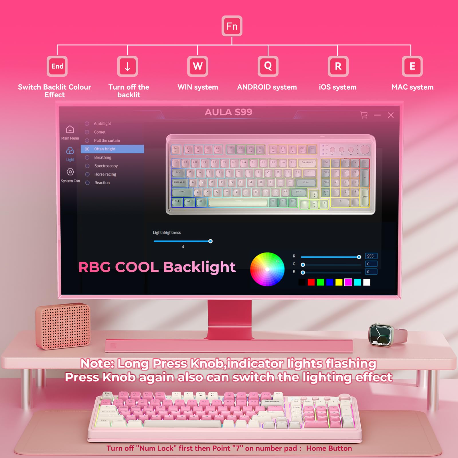 Keyboards 99-Key: Knob Design- Adjust volume, connection mode, backlit brightness/speed, RGB mode/color, all it takes is just a twist or a click.
