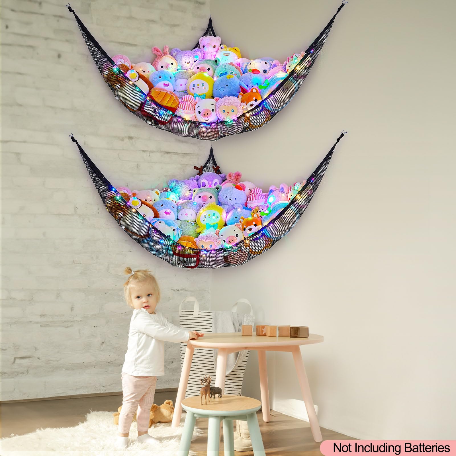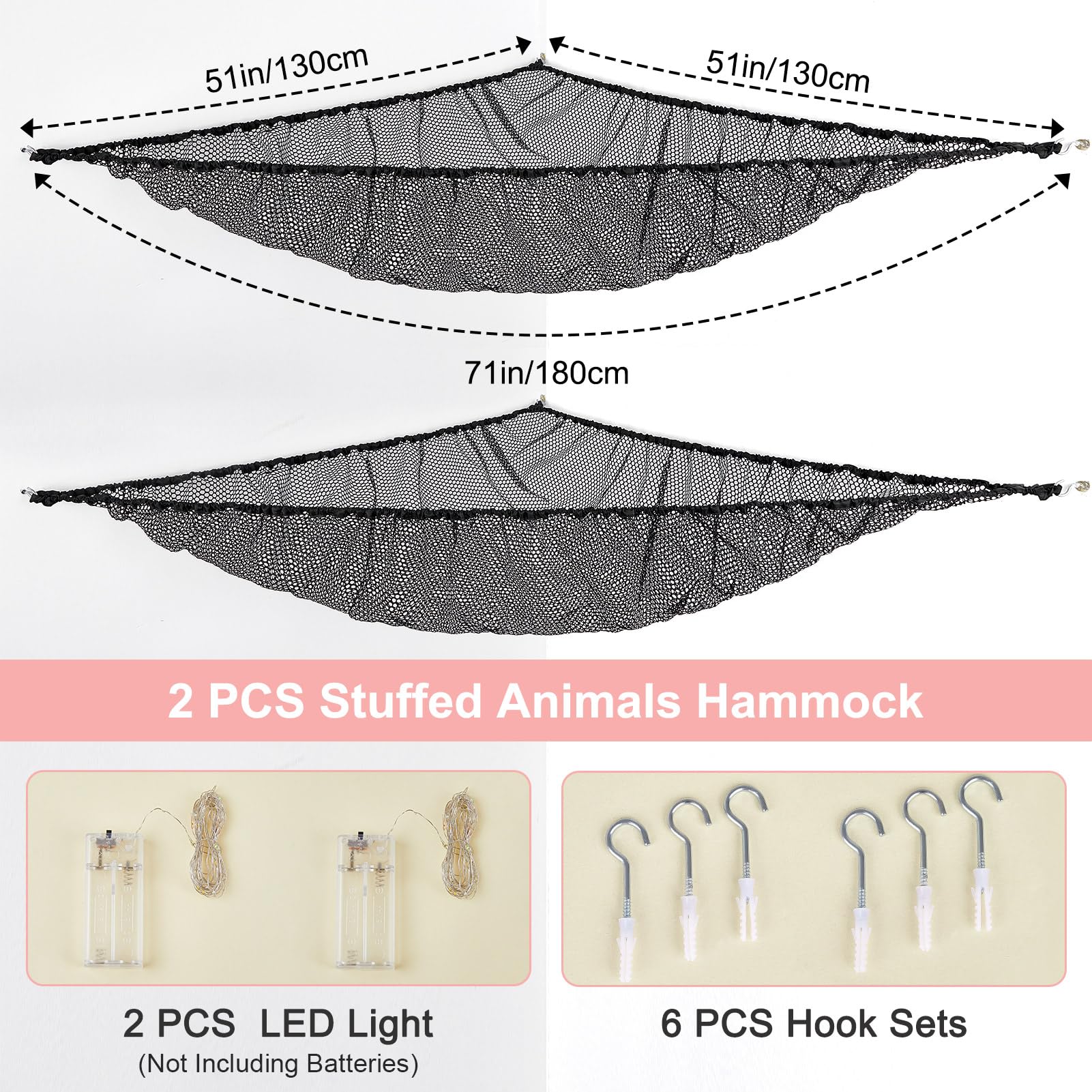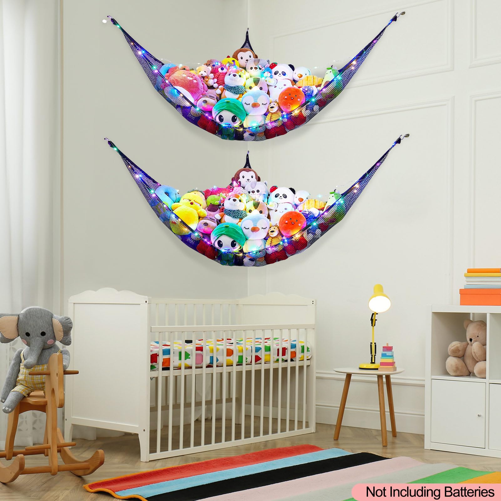 Package Included: 2 pcs stuffed animals hammock, 2 pcs 118 inches LED string light with battery box, Batteries Not Included, 6 pcs wall hooks for installation; Package are NOT including batteries