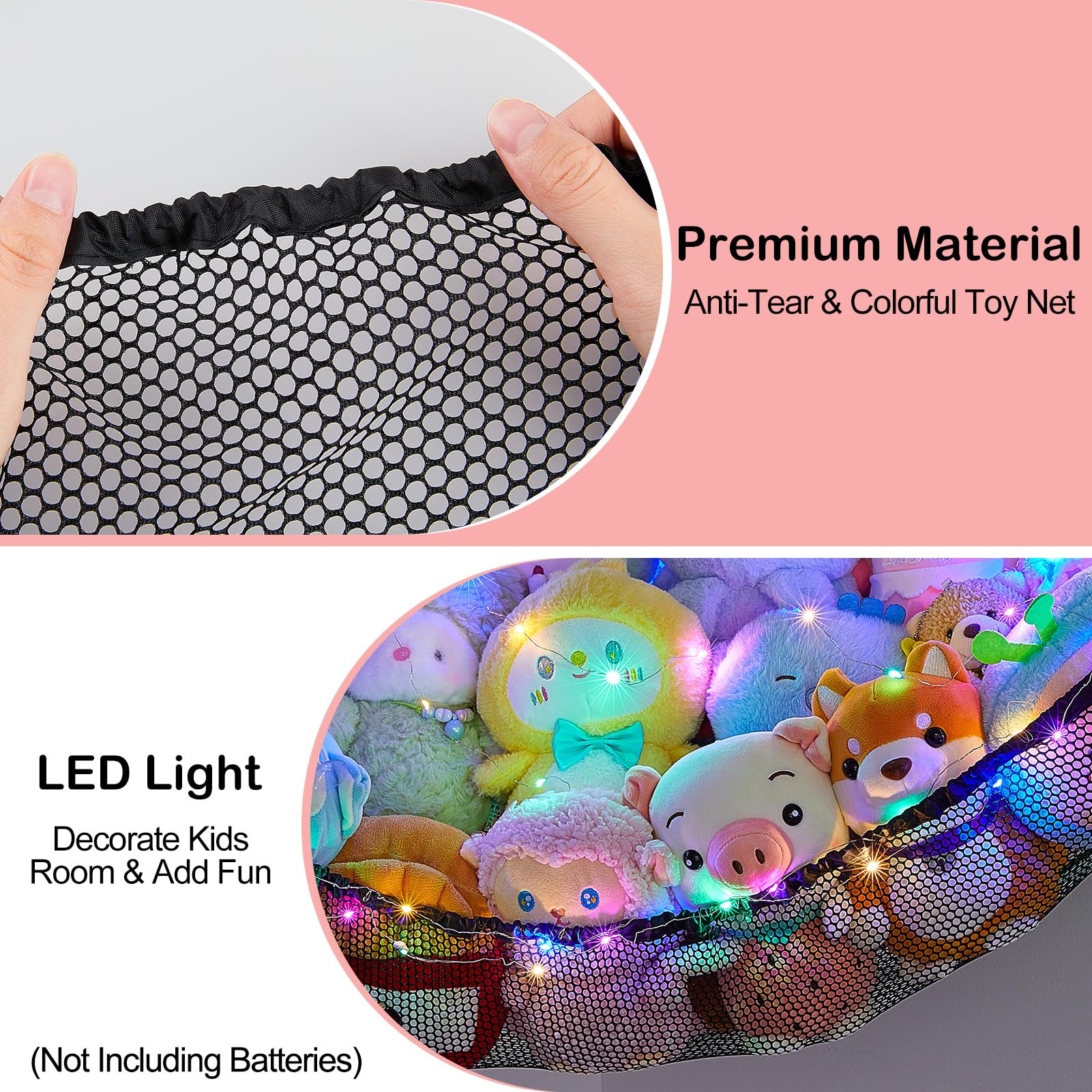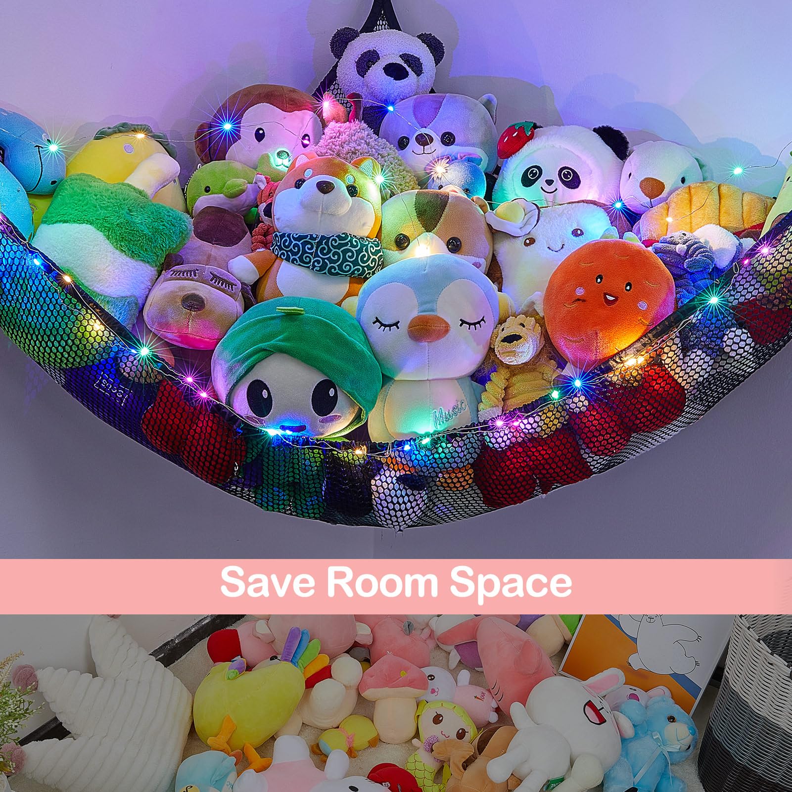 Toy Hammock: Our stuffed animals net or hammock can be a decoration for your kidsroom; Come with LED light, can add a cozy and fun atmosphere