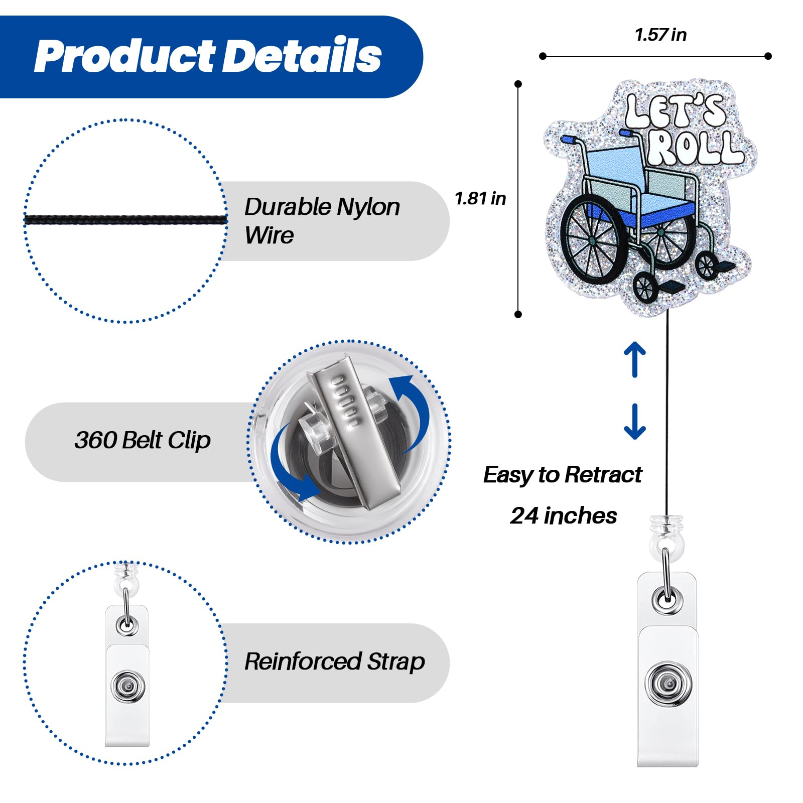 Retractable Cord: The retractable reel cord extends a maximum of 24 inches, more than enough to reach comfortably as far as your arm can reach. The flexible retractable feature enables you to effortlessly display your badge without removing it, enhancing your efficiency at work.