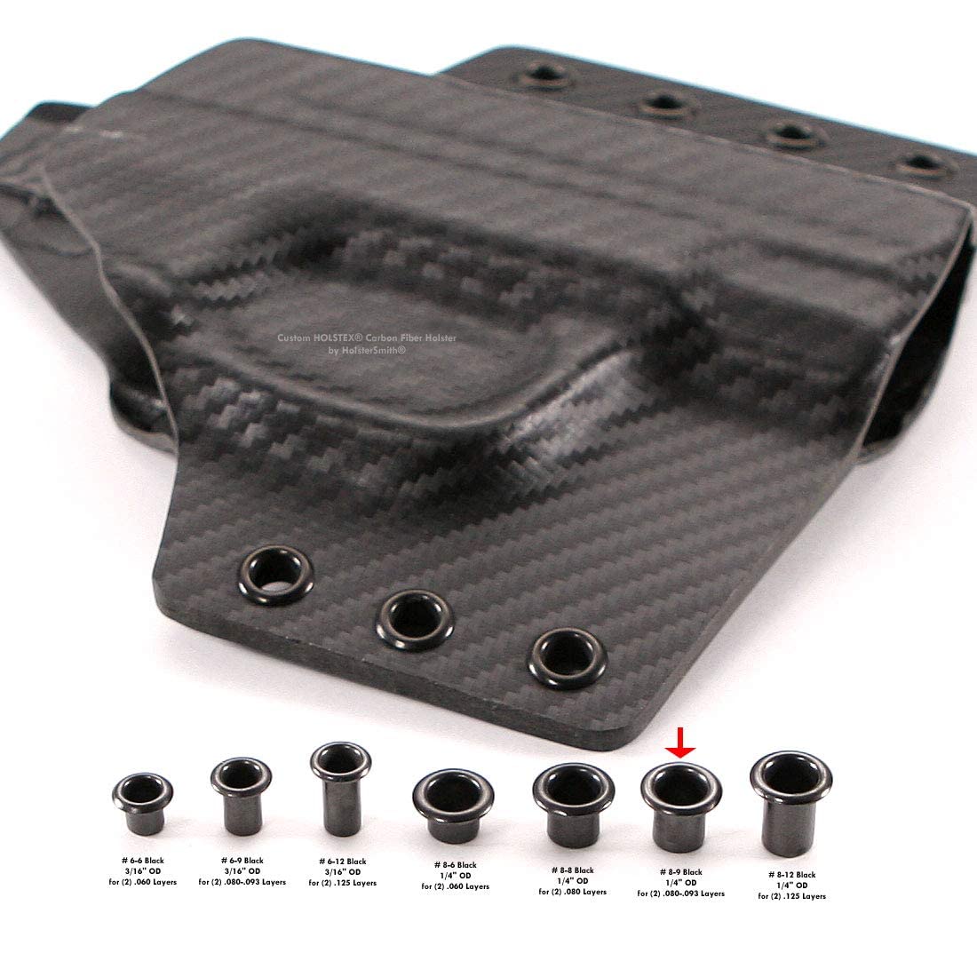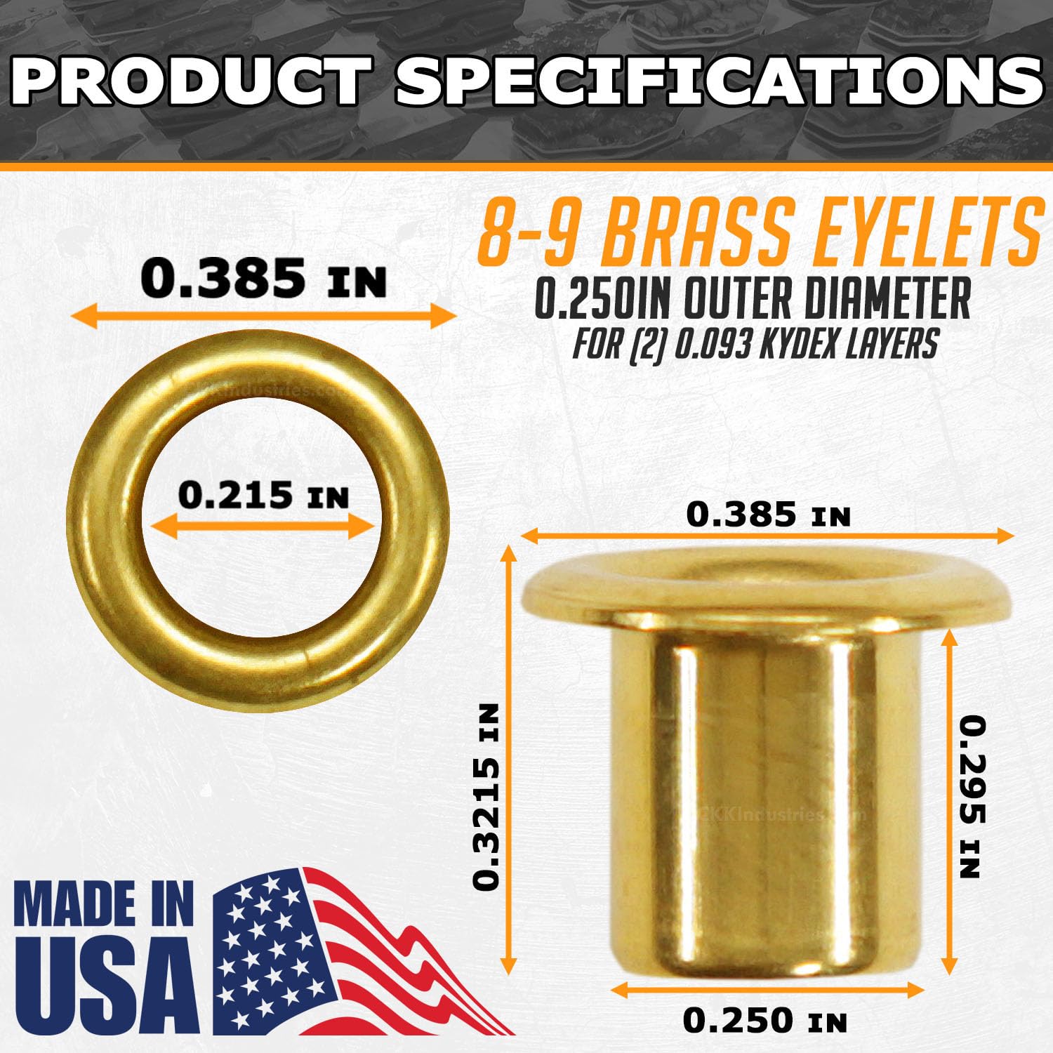Size: #8-9 | (1/4 in. diameter) - [For binding (2) layers of combined thickness from 1.60 inch to .180 inch.] | Professional Binding Eyelets: These are U.S.A made brass binding eyelets. They are commonly used in gun holster making, knife sheath construction, canvas cloth binding, upholstery finishing, and sewing crafts. HolsterSmith binding eyelets are available in multiple finishes and are top quality products that are used by professional thermoformers and industrial product manufacturers.