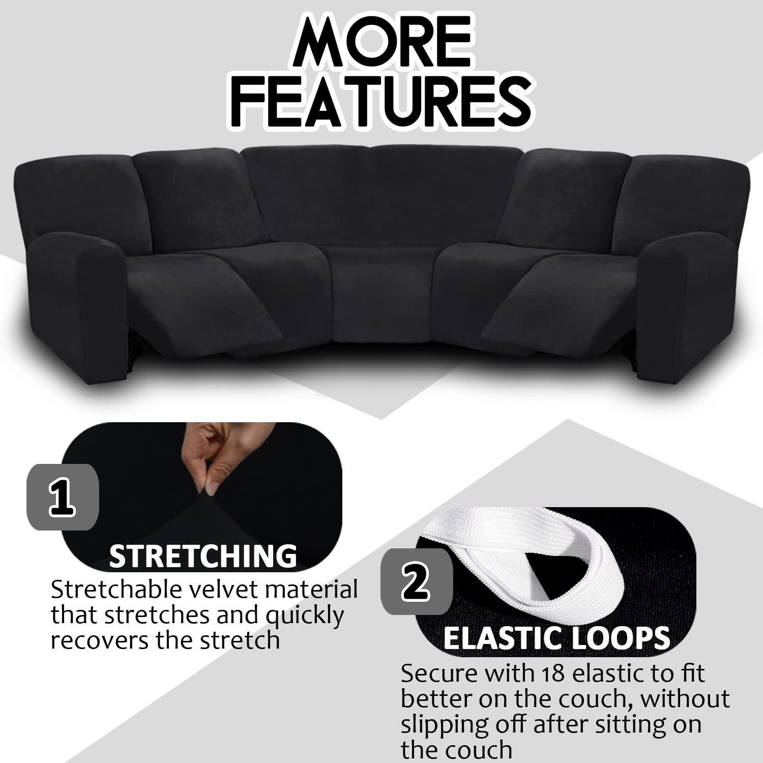 HIGH QUALITY MATERIAL: WE HAVE A PATENT ON THIS ITEM,This innovated PATENTED 7 piece L Shape reclining sofa cover is crafted from luxurious velvet plush fabric, and is very soft, comfortable and sturdy ULTIMATE DECORS sofa covers are as close to custom, made for a 5 seat L shape recliner sofa with the option to add additional seats and Console covers.