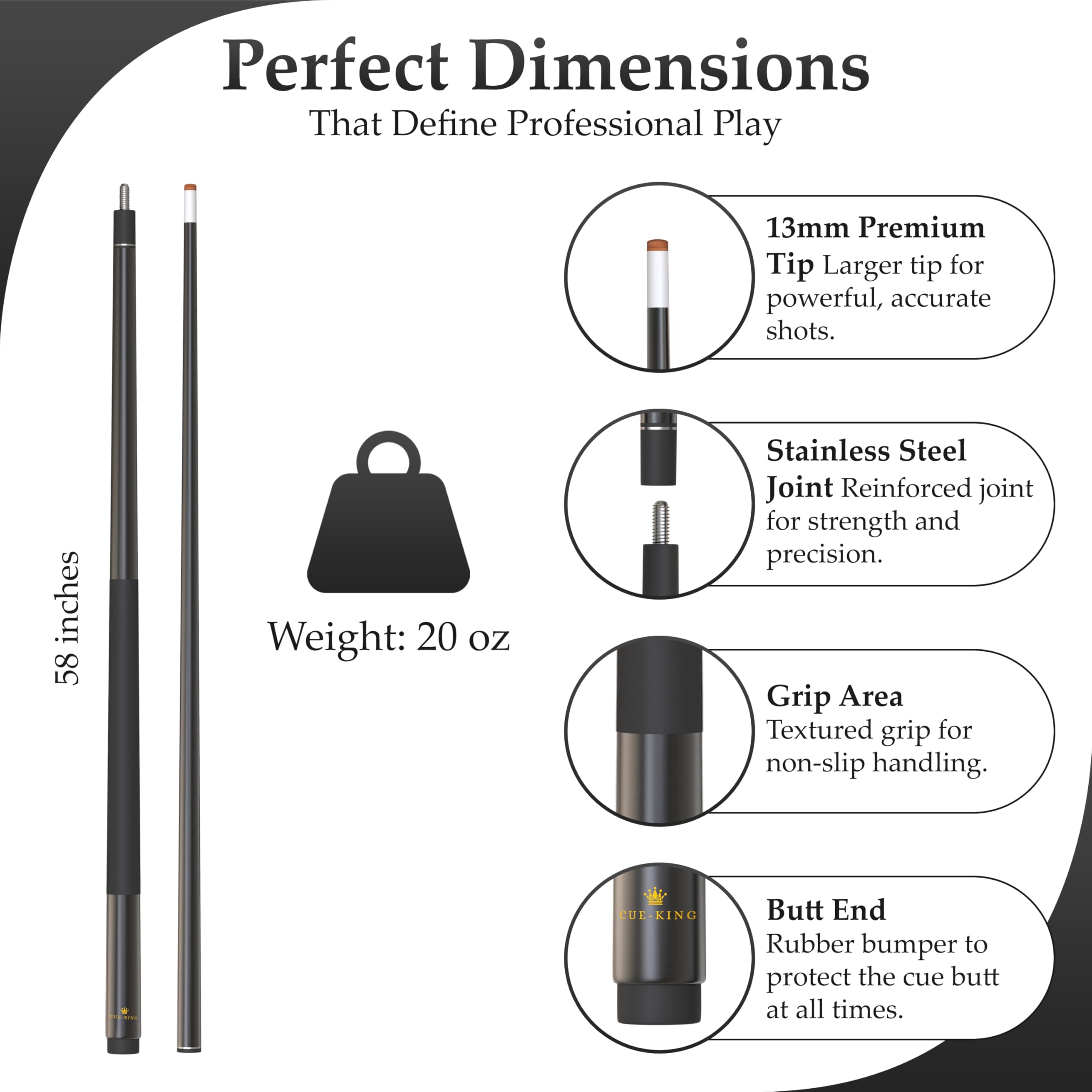 Specifications - Measuring 58 inches in length and weighing 20oz, this 2-piece cue is equipped with a 13mm tip, offering the perfect balance between power and precision. Ideal for players at any skill level