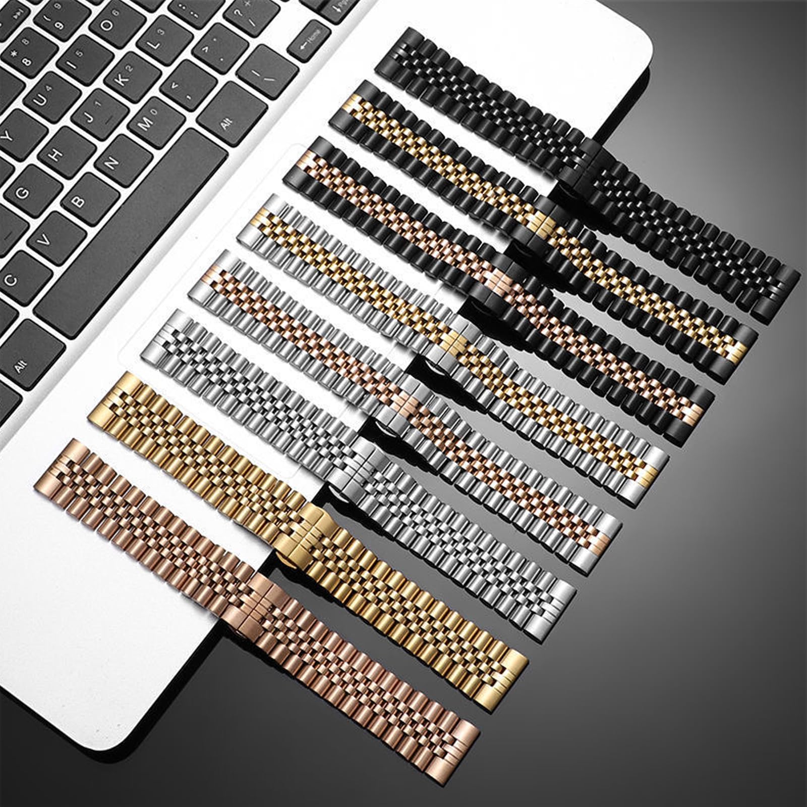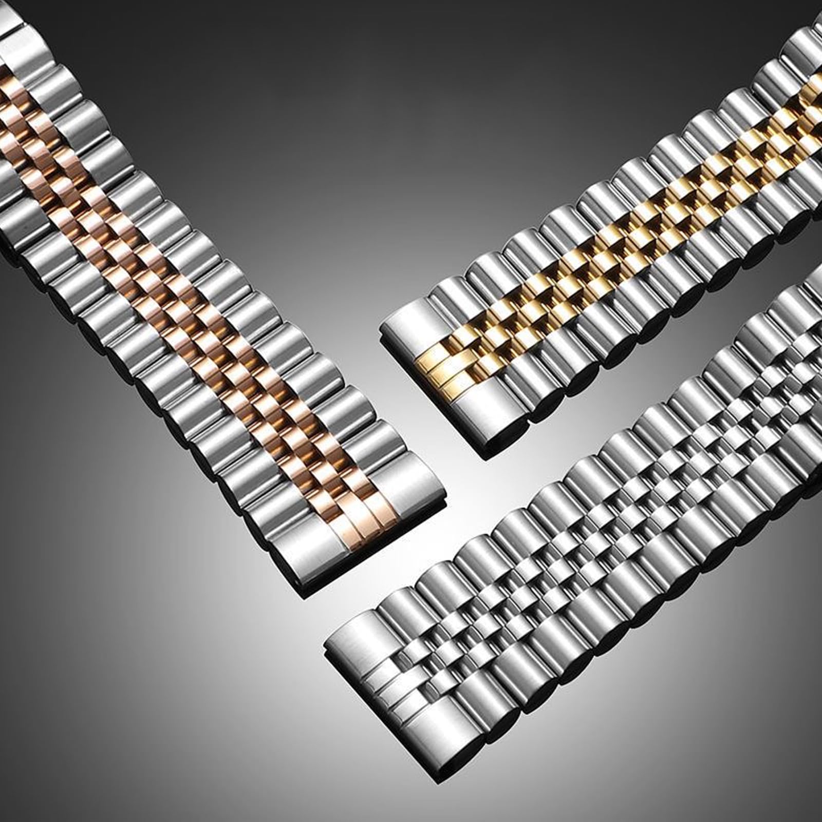 【Adjustable Band Length】Band length (about 185mm) can be adjusted by the enclosed link remover tool to fit your wrist perfectly. Jubilee Watch Band Strap Bracelet 6 Colors for choice: Gold, Silver, Black, Two-Tone Silver Gold, Two-Tone Silver Black, Two-Tone Silver Rose Gold. 2 Sizes: 20mm, 22mm.