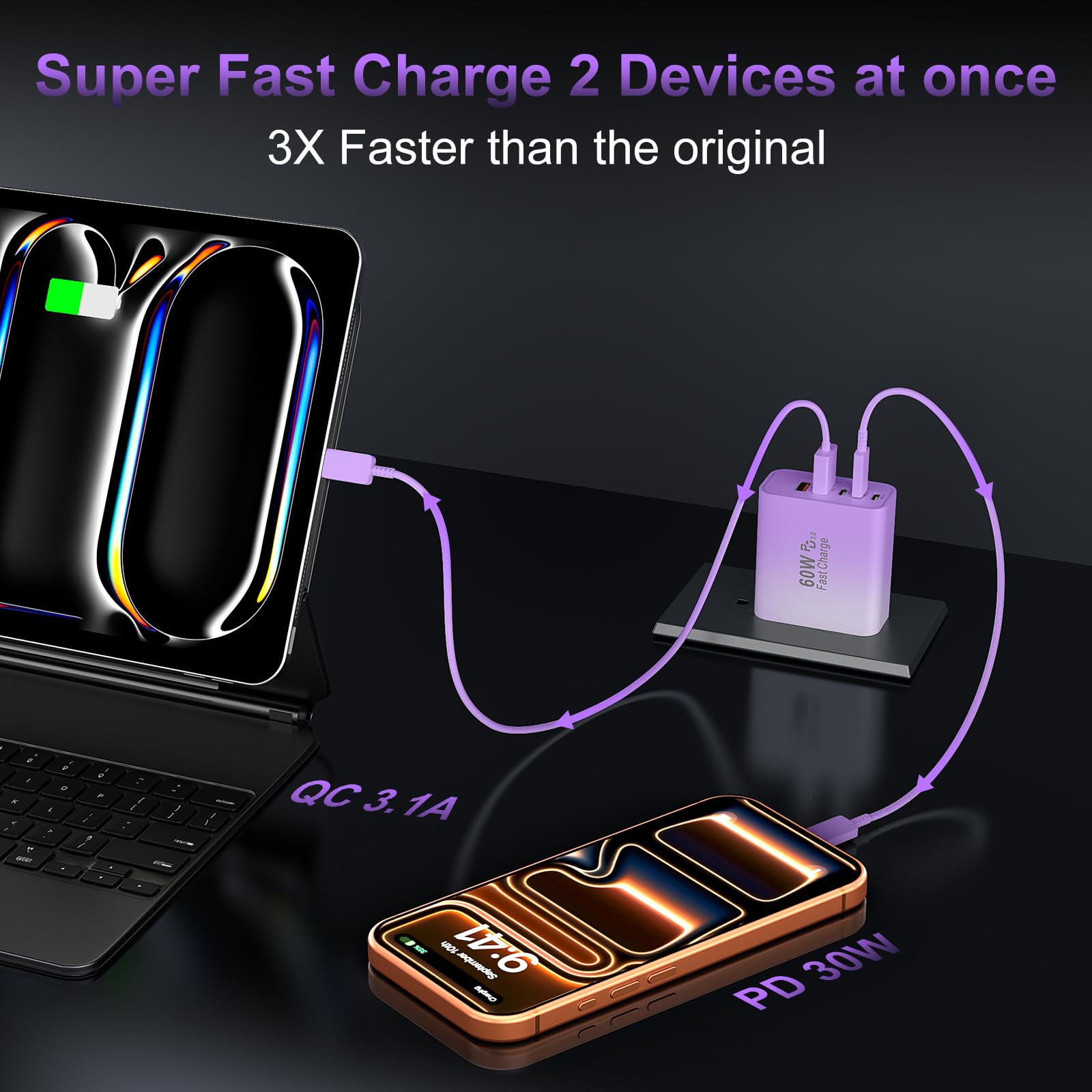 2-Pack 60W USB C Charger Fast Charging Blocks: Auorld 60W USB C Fast Charging Blocks support the Power Delivery and Quick Charge 3.0 fast charging functions with a total power of up to 60W. The USB-A port offers an output power of 3.1 A/5 V, while each USB-C port provides Max 30W output power, charge your Phone 16 15 Pro Max up to 65% in just 30mins, 10% faster than the original 20W USB C charger