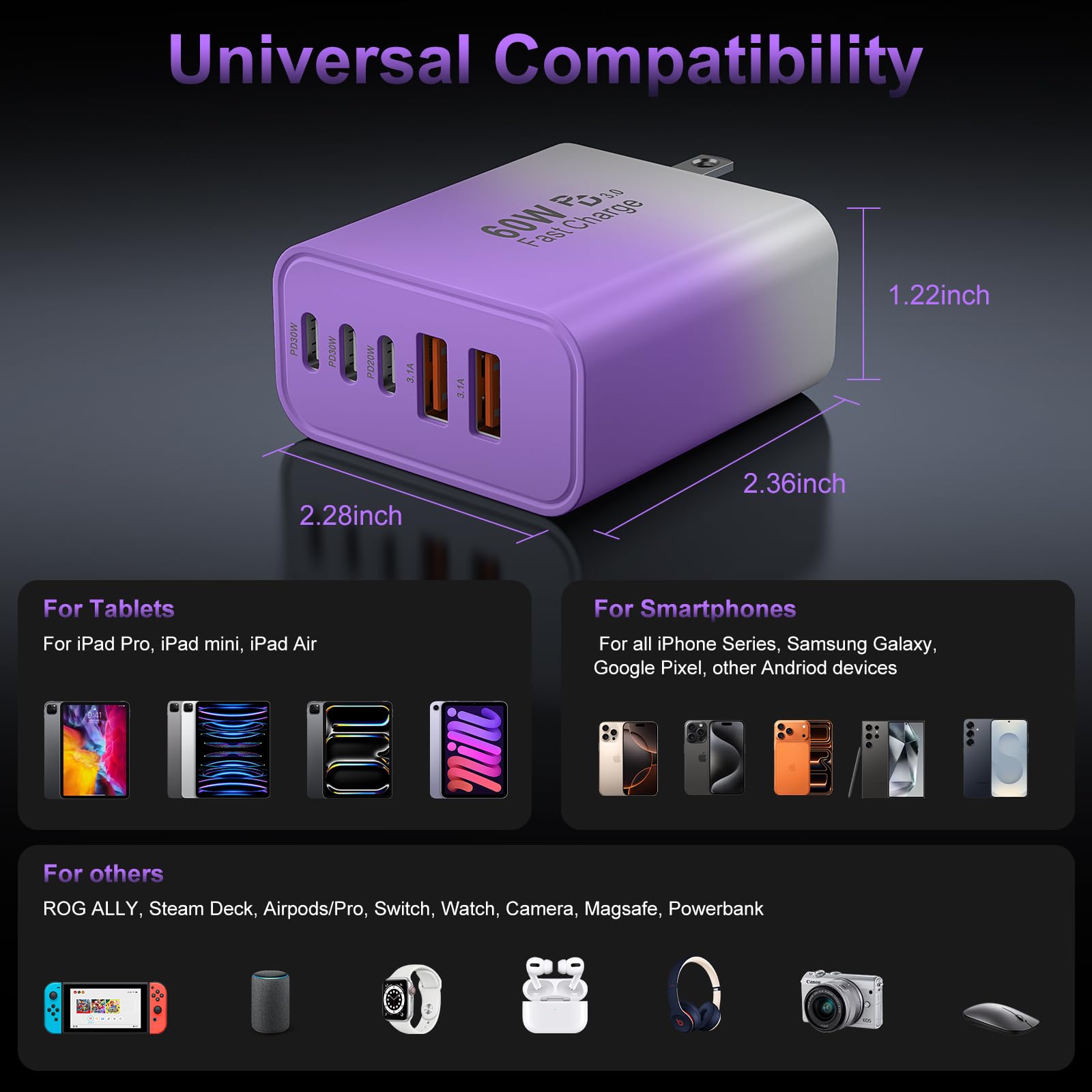 Compact and Portable Phone Charger Brick: Designed with the pocket-friendly compact body and 5-port charging cube, the USB C box is integrated to charge multiple devices at home, office and travel. Small size saves you space and fits perfectly into pockets, handbags, travel cases. Packaged with dual 60W 5-port usb c wall chargers (cable not included). If you have any problems with the c type charger block, please contact us