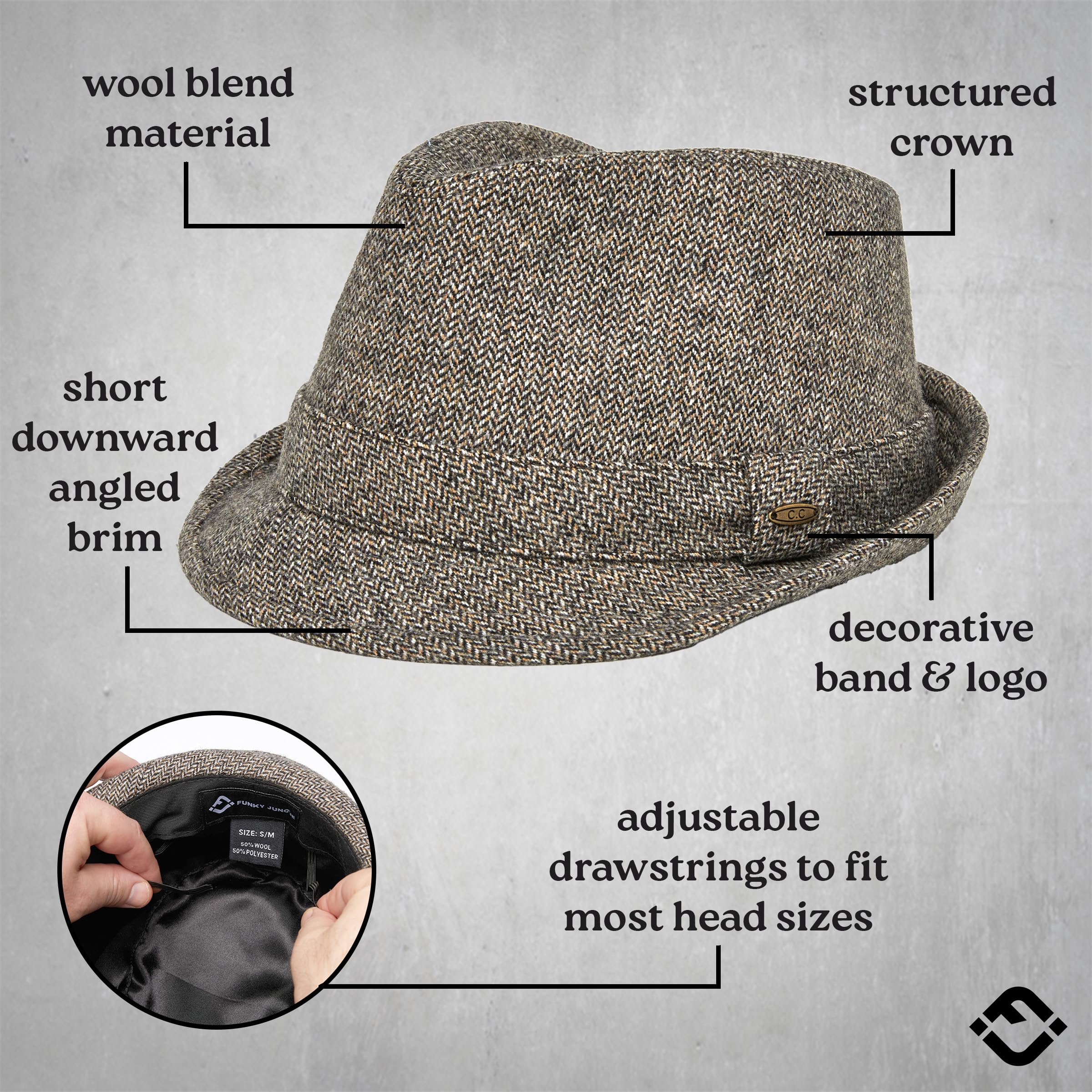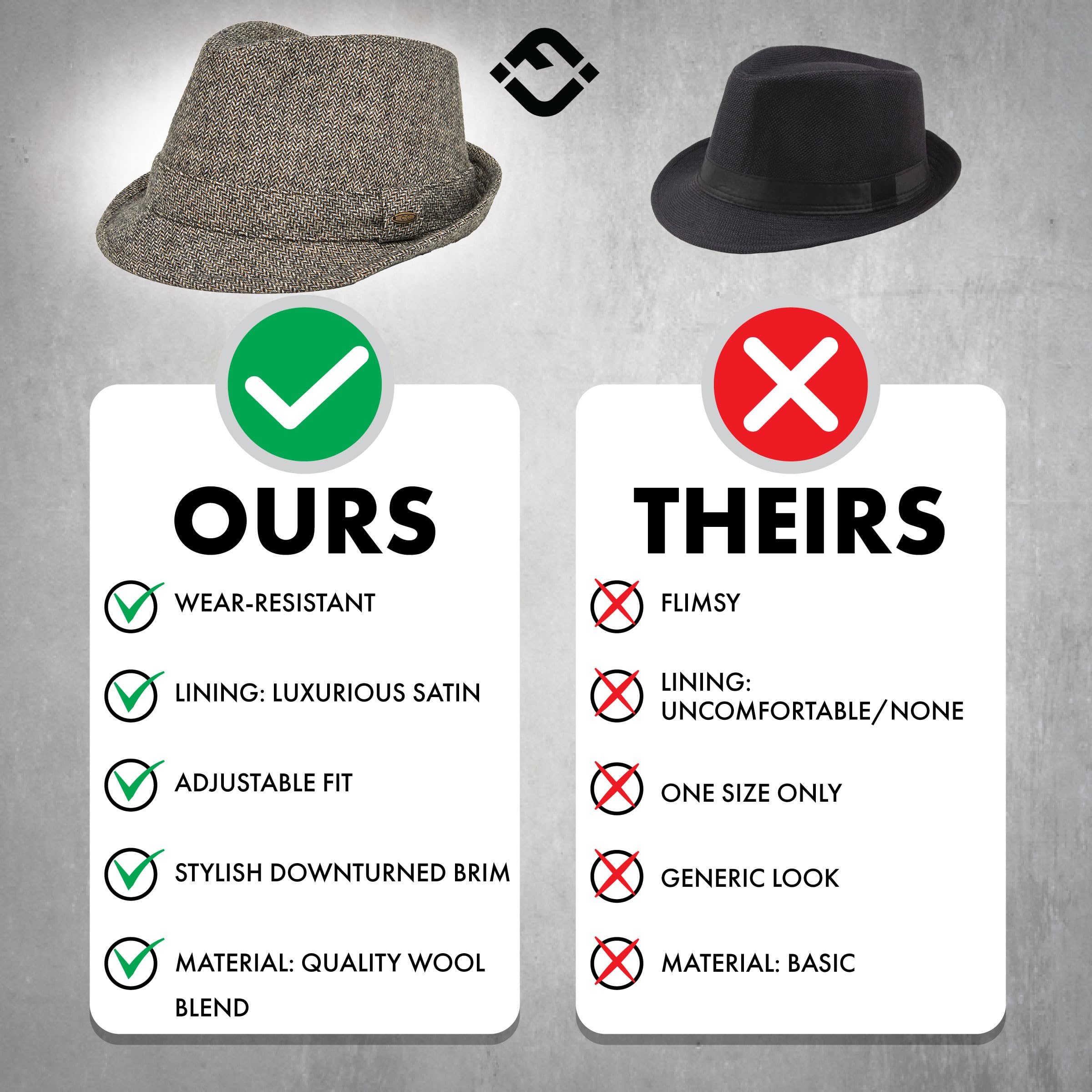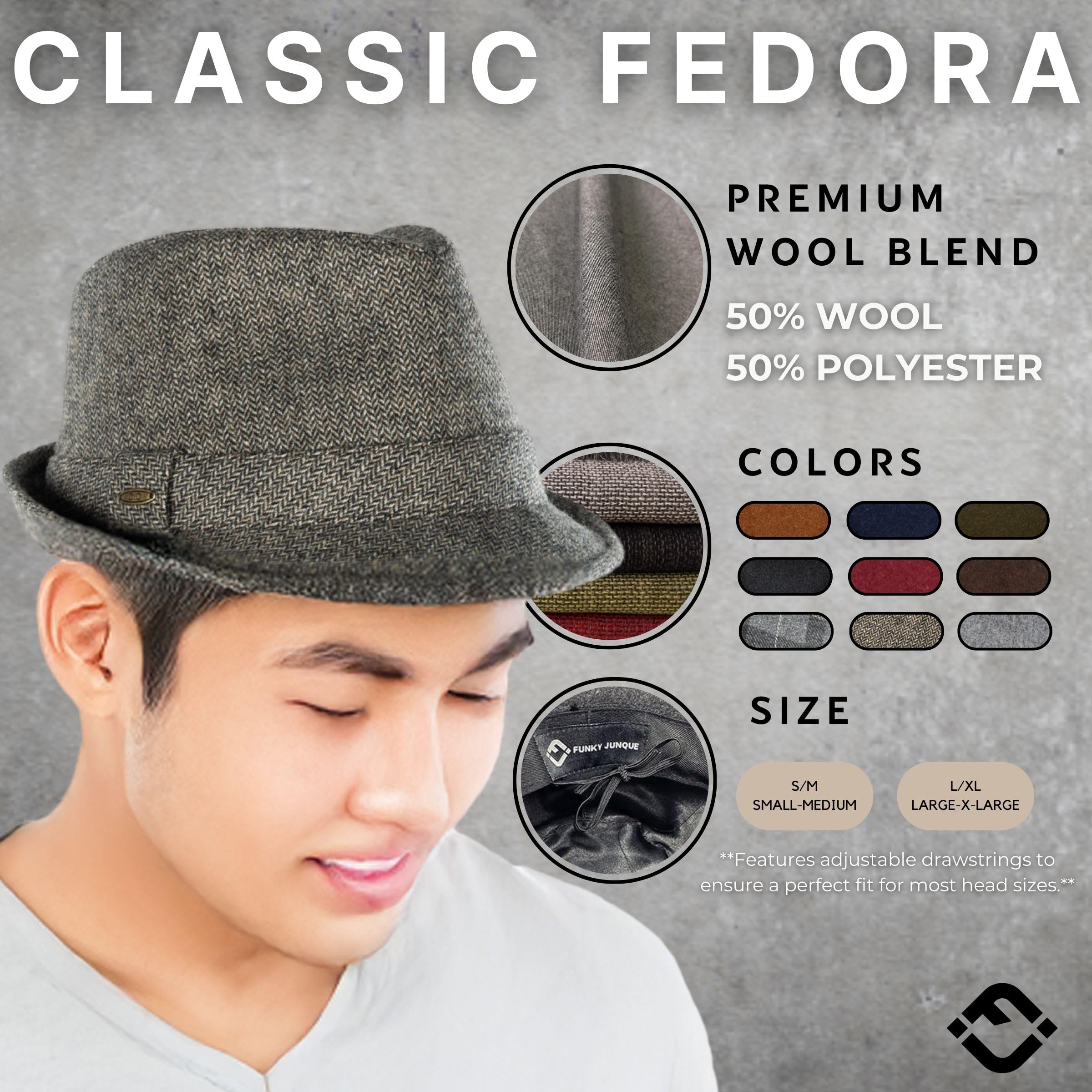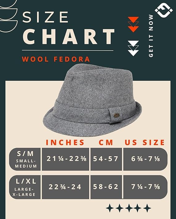 ADJUSTABLE FIT: Mens wool fedora hats like ours come with adjustable drawstrings to achieve a perfect fit. Whether you're a Small/Medium or Large/X-Large, our wool fedora hats for men ensure a perfect fit for most head sizes.