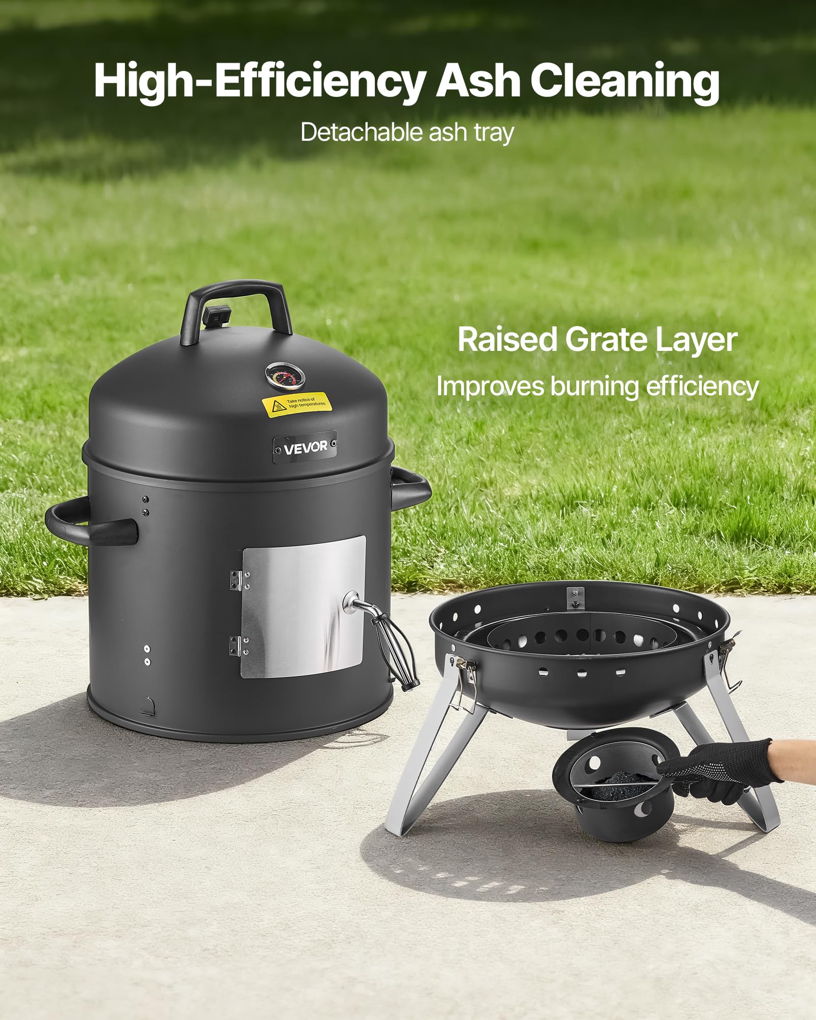 Easy to Clean: Designed with a raised grate layer, this charcoal barbecue smoker improves combustion efficiency and enhances ash collection. And the removable ash tray makes cleaning effortless, helping maintain a clean and tidy grilling area