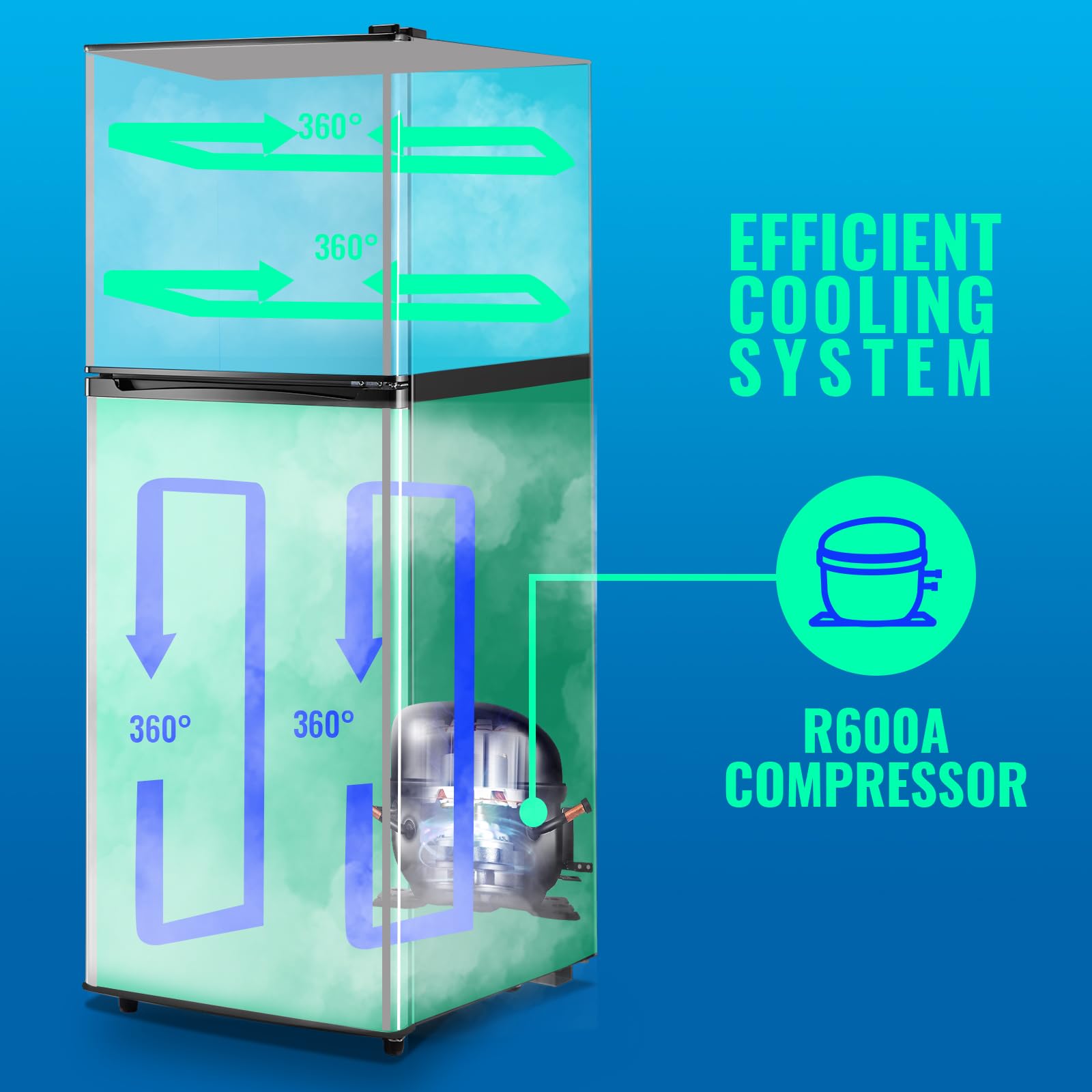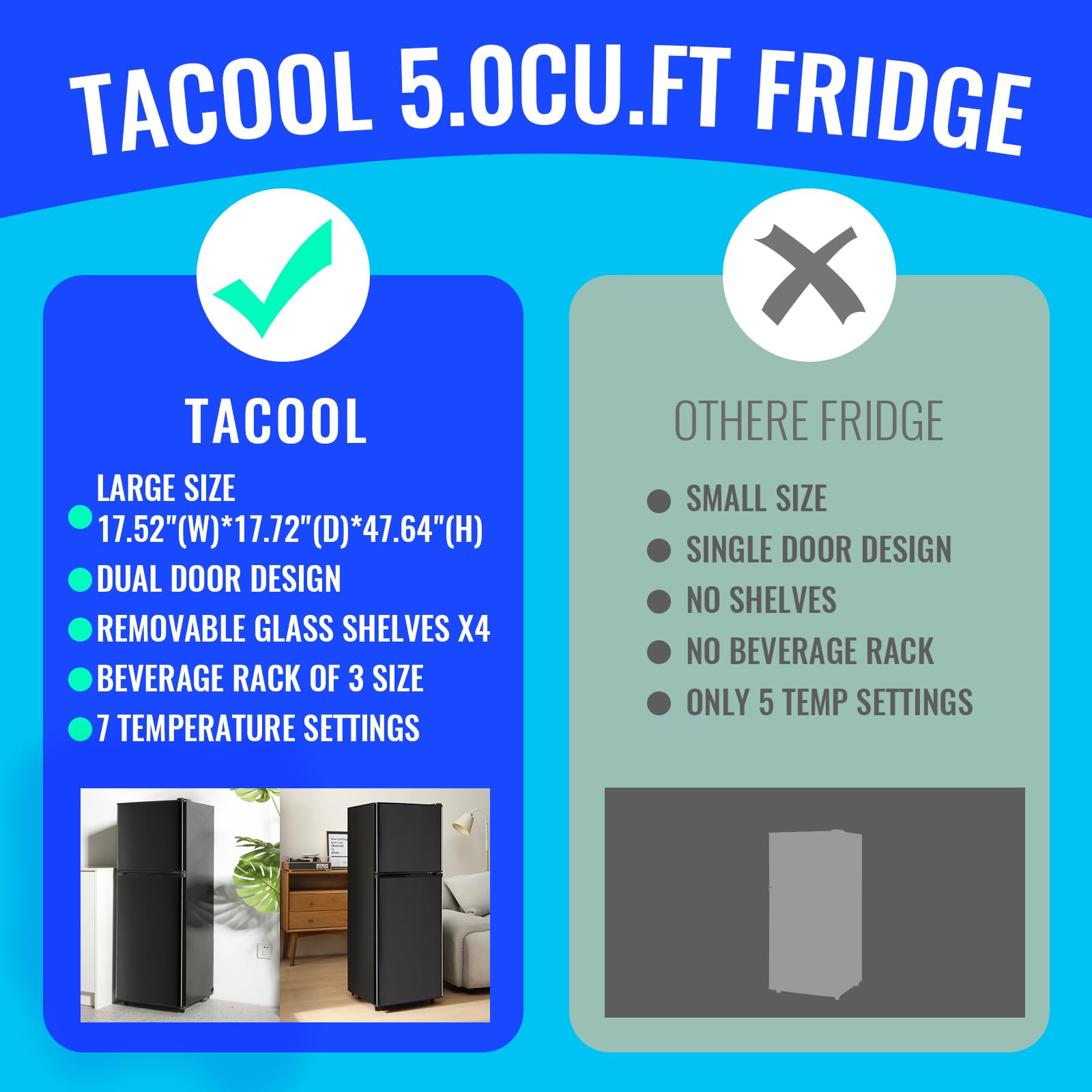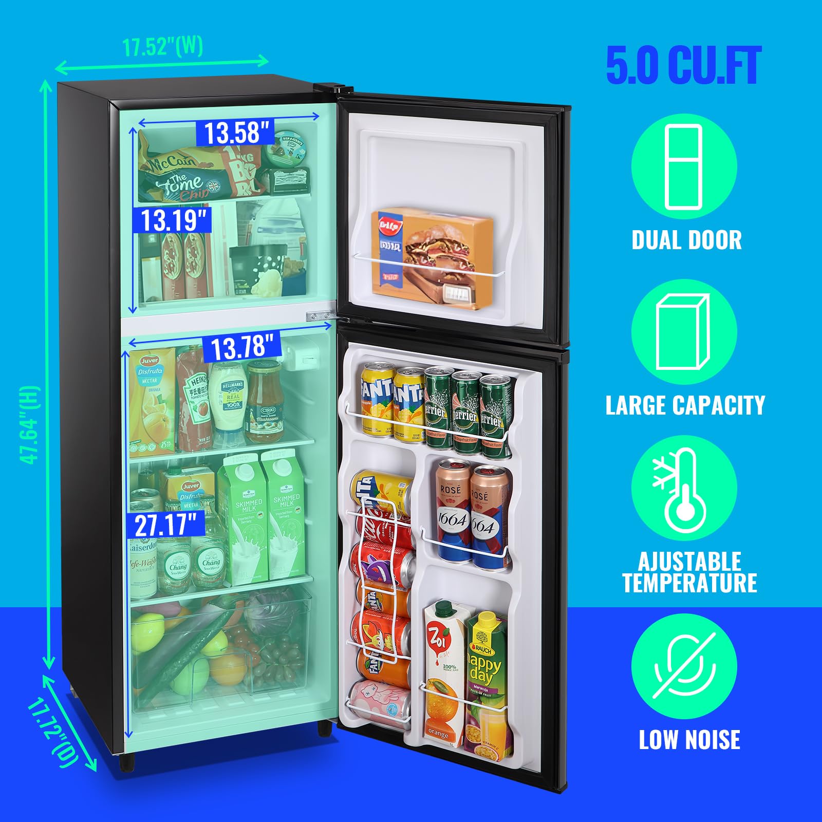 Large Store Capacity:The Small Refrigerator with top freezer measures 17.52" W x17.72" D x 47.64"H and has a large capacity of 5.0 Cu.Ft. The well-designed layout not only maximizes the utilization of space but also proves to be highly suitable for apartments, bedrooms, offices, and kitchens