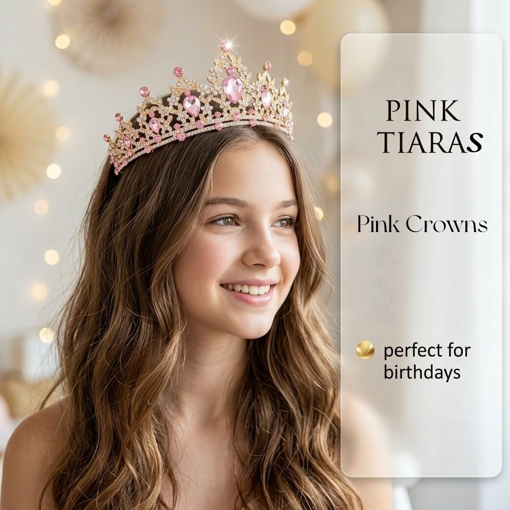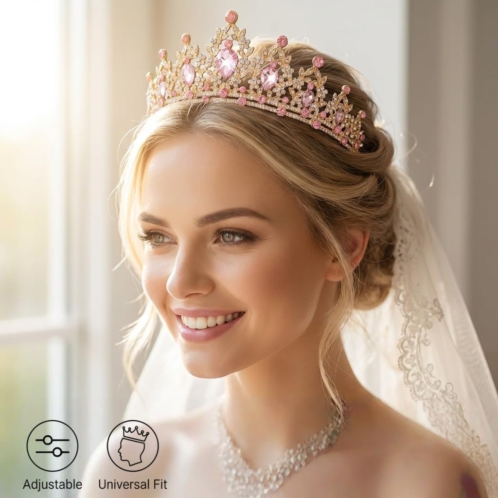 Pink Crown: This gold tiara is handmade by durable alloy and rhinestone. Pink Crystal Crown is Beautiful and practical., well-made and very solid, light and and comfortable to wear