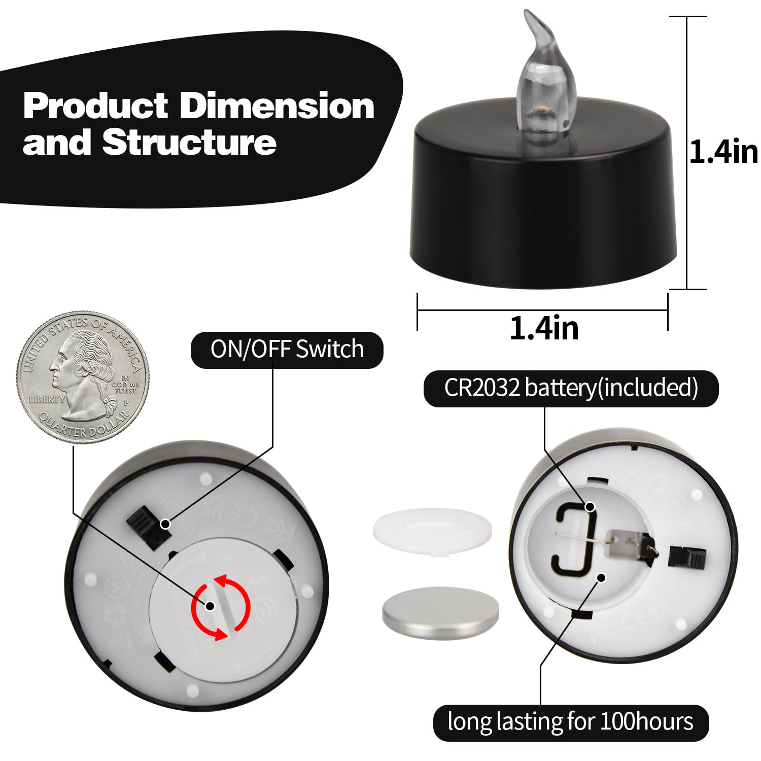 Specifications: Item name: Flameless tea lights Material: PP Tea light size: 1.4 x 1.4 x 1.4in Tea light weight: 0.3oz/piece Light color: Warm yellow Light effect: Non-flickering Switch mode: Manual switch Battery: 1pcs CR2032 per light(included) Working time: 100H+ Package List: 12 × Flameless tea lights(warm yellow, black base)