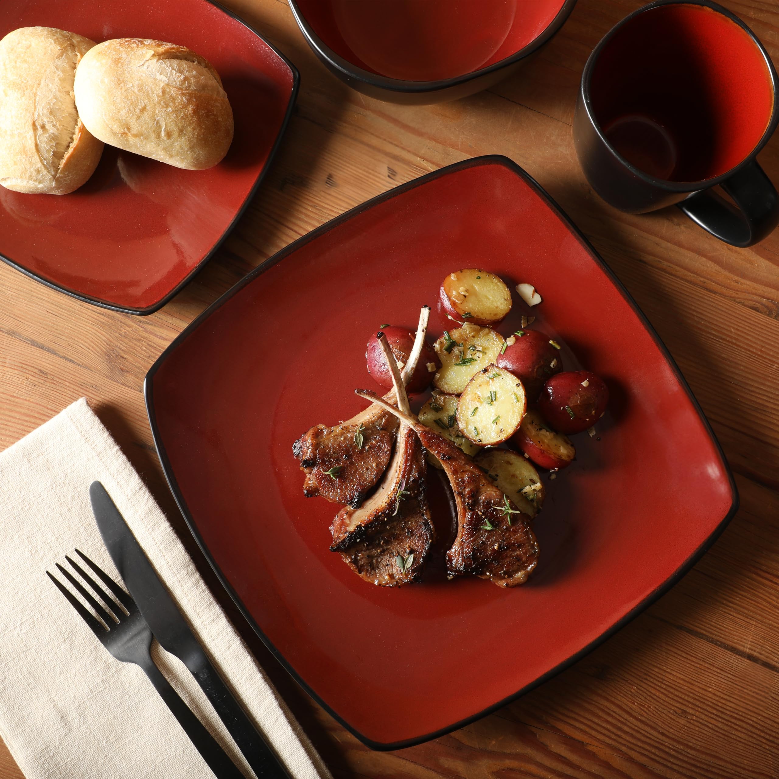 WHAT’S IN THE BOX: 16-piece square dinnerware set – service for 4 with 4 stoneware 11" dinner plates, 7.5" dessert plates, 6" (31 oz) bowls, and 12 oz mugs. Perfect for everyday meals, apartments, housewarming gifts, or modern kitchens.