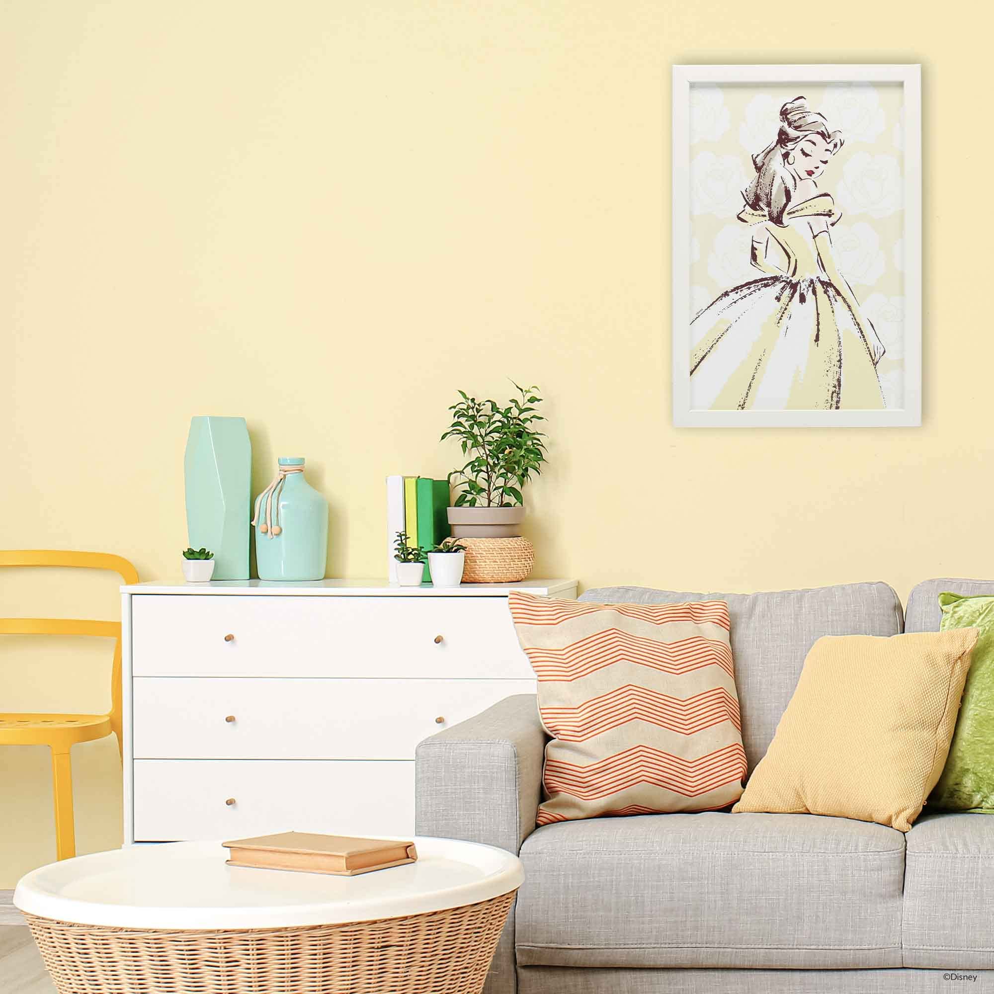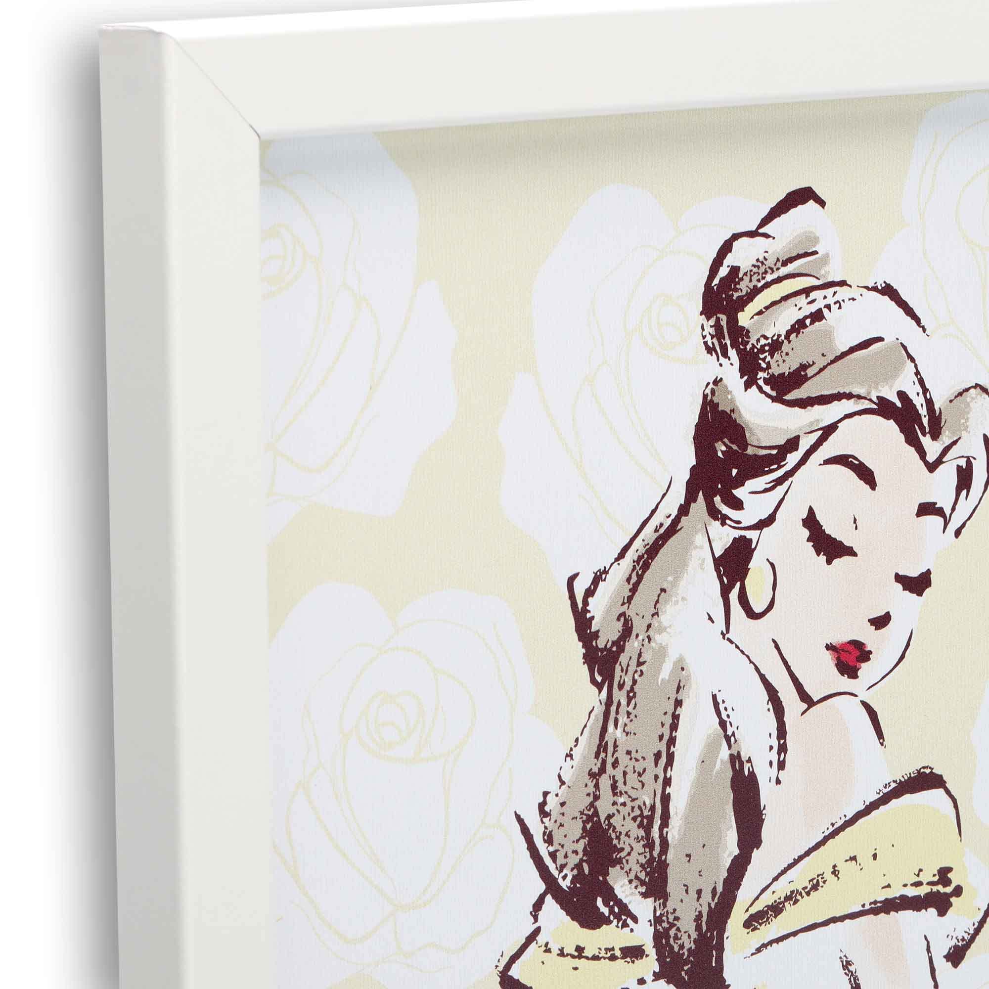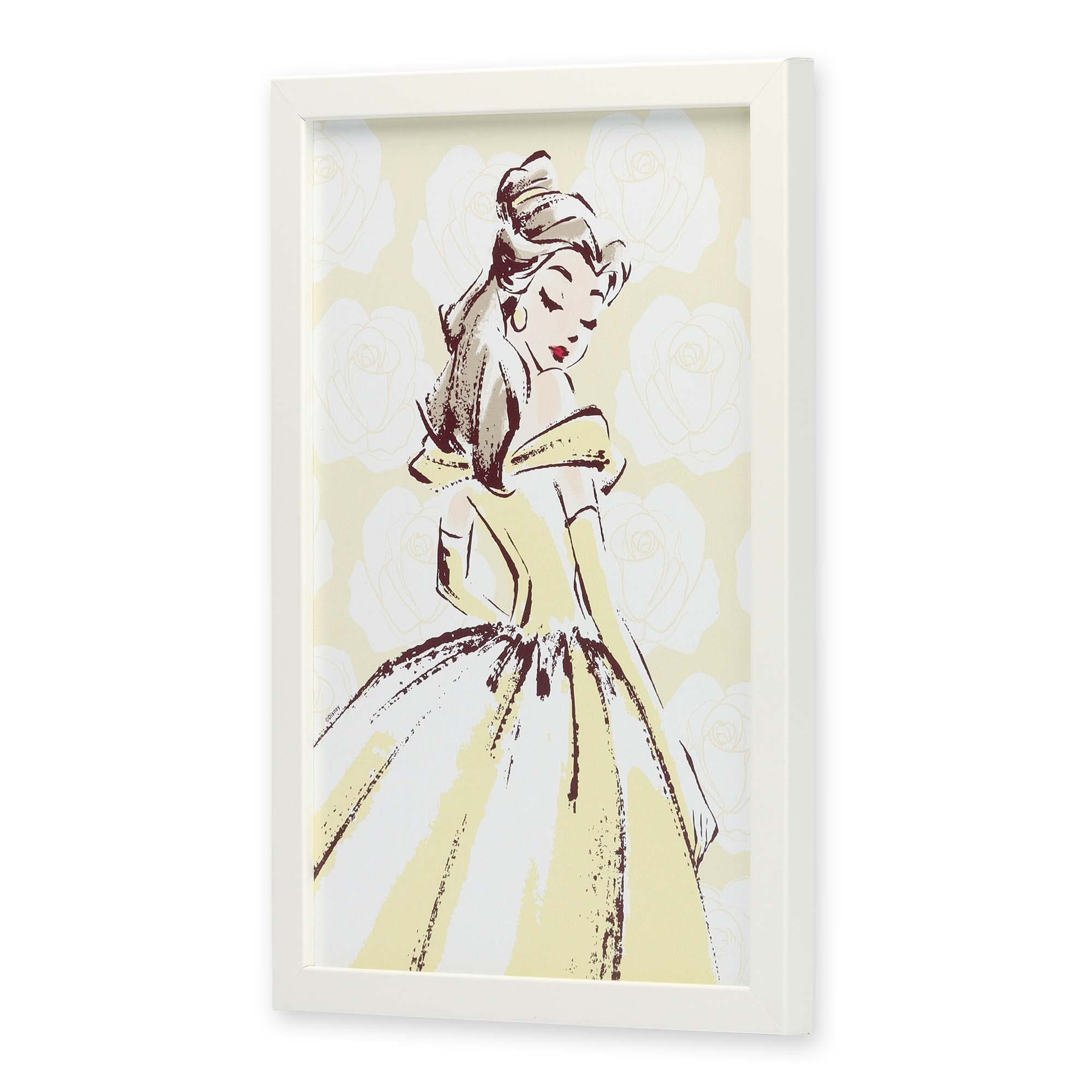 Framed Wood Wall Decor: Boasting a watercolor-style, sketched depiction of Belle against a yellow, rose-covered background, this breathtaking wall art is whimsical, graceful, and downright magical.